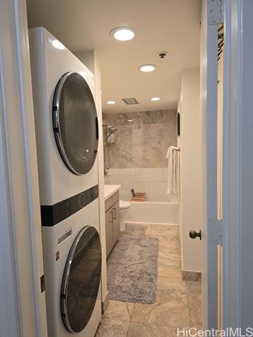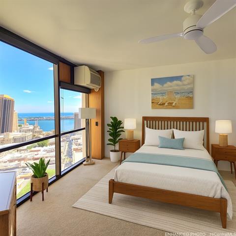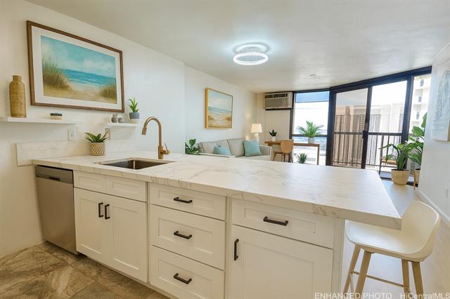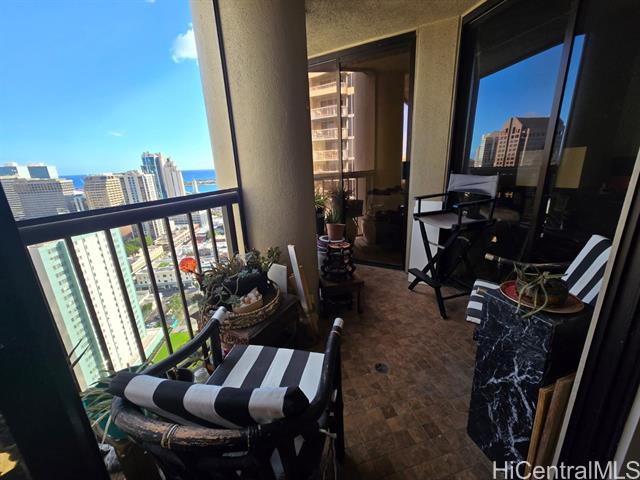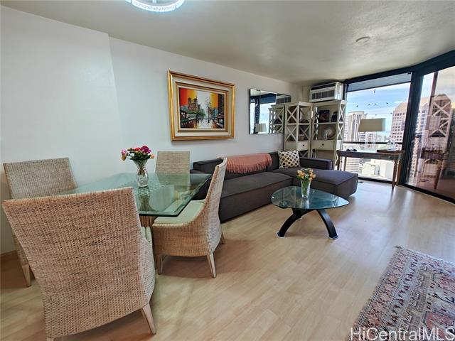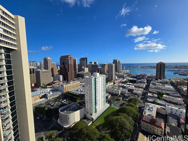 - Step in to luxury in this absolutely gorgeous renovated 2 bedroom 2 bathroom condo with ocean, mountain, and city views conveniently located in Chinatown! This grandly spacious unit on a high floor has been upgraded with an open concept kitchen, corian countertops, Pergo, and Travertine flooring and showers. The unit has 1 designated parking stall, an in unit stacked washer/dryer, and covered lanai space. Amenities include a BBQ area, Meeting Room, Pool, Recreation Area, Recreation Room, Resident Manager, Security Guard, a community library, and a dog park. Electricity is billed monthly based on usage. The current sub meter charge is $4.19/mo.