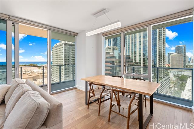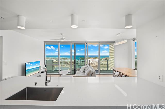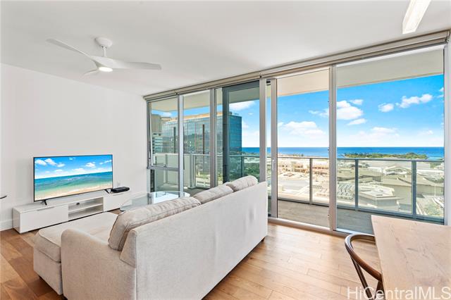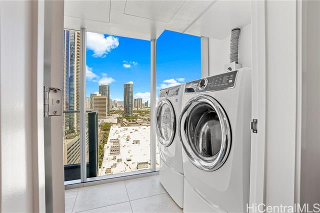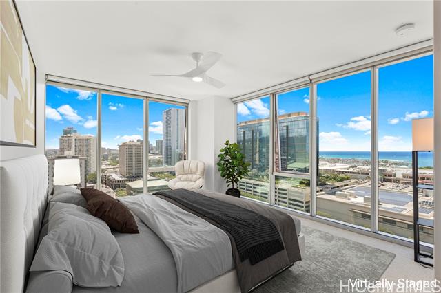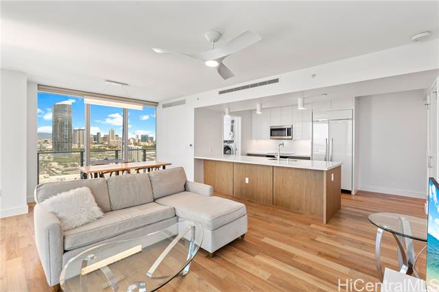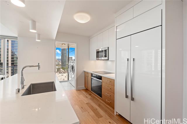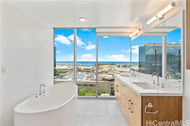 - Experience elevated island living in this stunning 2-bed, 2-bath corner unit offering sweeping views of the ocean, city, Magic Island, and harbor. As the largest 2-bedroom floor plan in the building, it features floor-to-ceiling windows and split AC throughout. The modern kitchen is equipped with glossy white cabinets, quartz countertops and premium Sub-Zero, Bosch and Wolf appliances. The side-by-side washer and dryer is located just off the kitchen. The primary suite offers ocean views, a walk-in closet and a deep soaking tub. Additional features include two covered side-by-side parking stalls and built-in pet food trays. Enjoy the inviting and convenient amenities: pool, spa, gym, BBQ cabanas, club lounge, theater, guest suites, dog park, EV charging stations, and 24/7 security—all in an unbeatable location near Ala Moana Beach, shopping, and dining! And for added peace of mind, Azure is fully covered with 100% hurricane insurance.