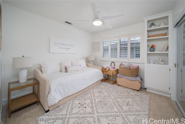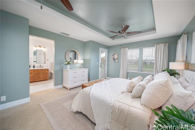 - Golf Course Frontage Home & Luxury Upgrades & Stunning Views! This upgraded golf course frontage home offers breathtaking views and is just a short distance to a pristine Hawaiian beach. Never rented and move-in ready, it features real wood flooring, plantation shutters, and crown molding in the primary suite. Stay comfortable with central A/C and six ceiling fans. The upgraded kitchen boasts an expanded island, while the remodeled bathroom adds elegance. OWNED SOLAR PANELS enhance energy efficiency. From the primary suite’s covered lanai, take in stunning sunsets over Hoakalei’s golf course and water features. The lush yard with tropical blooms creates a serene escape. Just a 10-minute walk to One‘ula Beach and close to surf spots and the LineUp at Wai Kai, featuring dining, shopping, and a world-class wave pool. With resort development on the horizon, this home’s value and appeal will continue to grow. Don’t miss this rare opportunity to own a luxury golf course home in paradise!