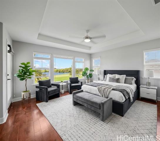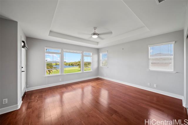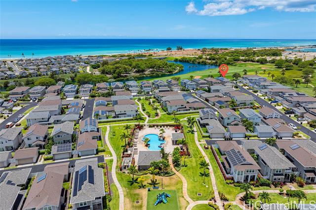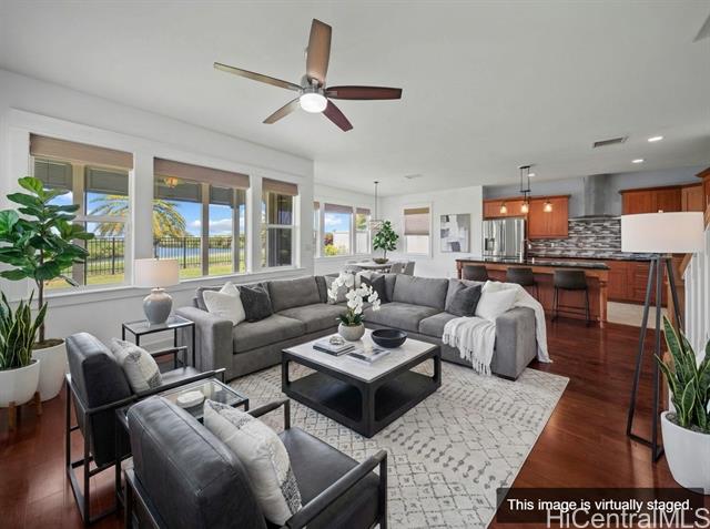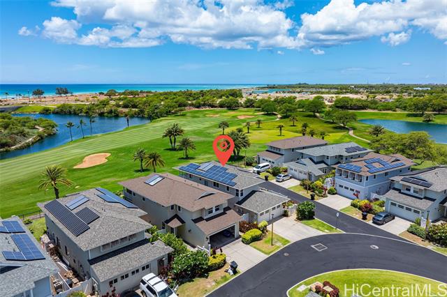 - Great price adjustment to sell! Don't miss the opportunity to experience the finest of Hoakalei community living! This stunning corner unit golf course view home in the gated community of Kipuka is nestled on the 15th fairway of the Hoakalei Country Club. Boasting 4 bedrooms, 3 bathrooms, and an upstairs loft/office space, it features engineered hardwood floors, plantation shutters, and a beautifully upgraded kitchen. Freshly painted walls and garage add to the home’s charm. Enjoy breathtaking golf course, twilight, and ocean views from both levels of the home. Additional features include an Ecobee thermostat and 36 owned/net-metered solar panels for energy efficiency. Step out onto the second-floor lanai and immerse yourself in the beauty of the evening. The community offers fantastic amenities, including a pool, BBQ pits, and a playground—perfect for relaxation and entertainment.