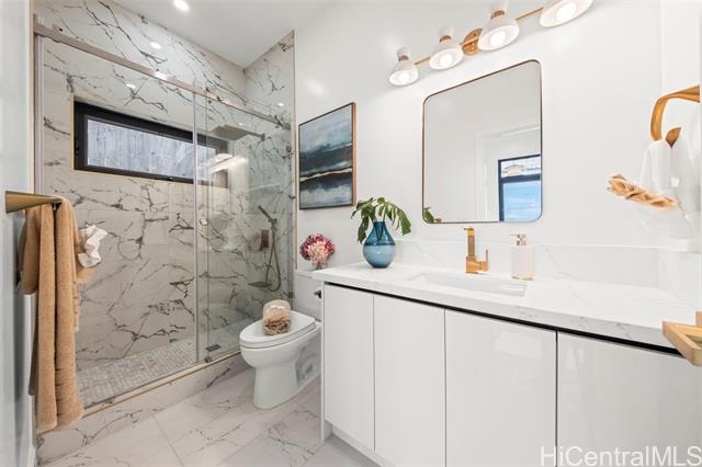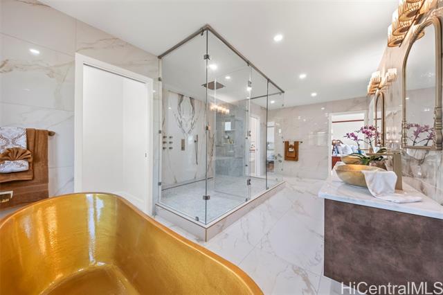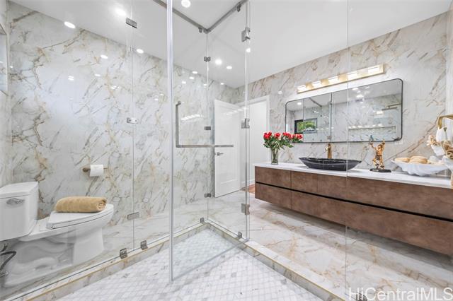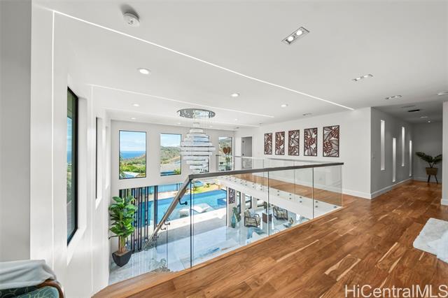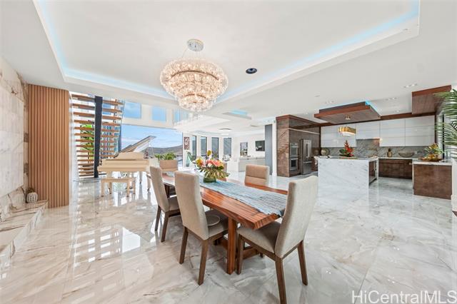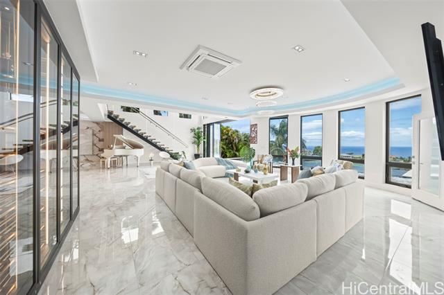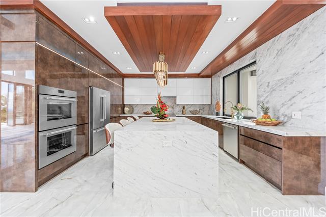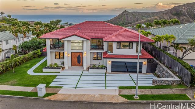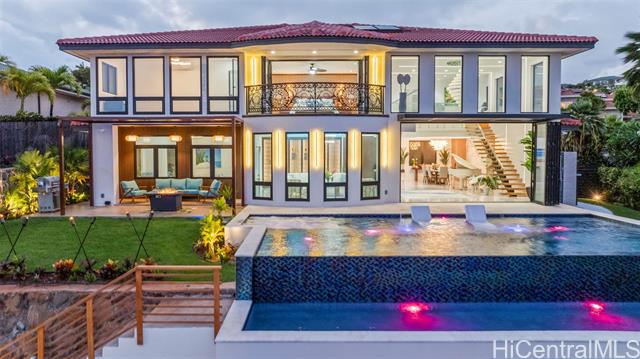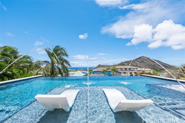 - NEW CONSTRUCTION. Luxury living in this stunning 5-bedroom, 5.5-bath custom-built estate in Na Pali Haweo. Constructed with steel frames, beams, and columns, this home offers breathtaking panoramic views of the ocean, Koko Crater, and vibrant sunsets. The expansive open floor plan showcases soaring ceilings and designer Thermador appliances, including a magnificent Calacatta Italian marble island. LED lights are embedded in the walls and in the custom European kitchen cabinets that have drawers with soft touches. Ininity smart, self-cleaning saltwater pool and spa feature a sophisticated glass finish. Each bedroom has ensuite bath, primary has golden bathtub, and one room is flooded with natural light from seamless corner windows. Enjoy stylish porcelain floors from Spain and sky-high crystal chandeliers. Throughout, white and gold slab quartz, marble, and elegant wainscoting enhance the luxurious ambiance, including golden vanity sinks and a gold bathtub in primary bath. 123 Waihili embodies modern island living, where you can experience tranquility and relaxation with this indoor-outdoor lifestyle that features a serene zen retreat. More than one photo was enhanced. Ask 3-D Tour.