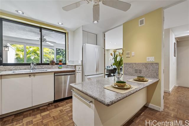 - Located on the tranquil slope of Diamond Head across from Kapiolani Park and the beaches of the Gold Coast is this rarely available 3 bedroom, 2.5 bath multi-level townhome. Uniquely designed, and 1 of only 4 in the complex, this unit has preferable placement, set back from the public road. Enjoy the spaciousness of the living room and primary bedroom suite, and the overall layout of the home, which facilitates light and air throughout. The primary suite boasts a balcony with double doors, a built-in window lounge, a custom shower, a walk-in closet, and a private office. The living room extends to the covered patio and features floor-to-ceiling windows on two sides, capturing views of lush landscaping and some azure ocean. There is indoor outdoor living for al fresco dining, relaxing, and entertaining on the large decks and screened in patio. The attached 2-car garage has four spacious storage closets, and there is adjacent guest parking. This townhome has the feel of a single-family residence and the gorgeous yard is taken care of for you. This is your opportunity to reimagine this home with your personal touch. A wonderful value in one of Hawaii's most desirable neighborhoods.