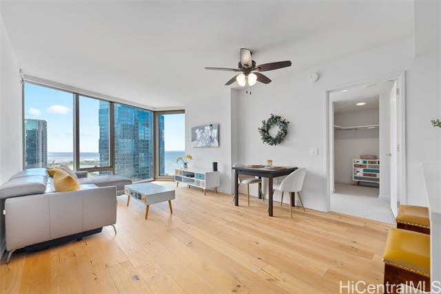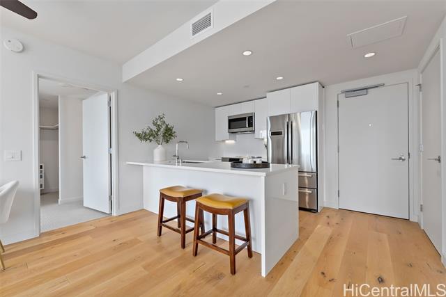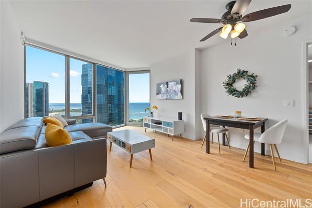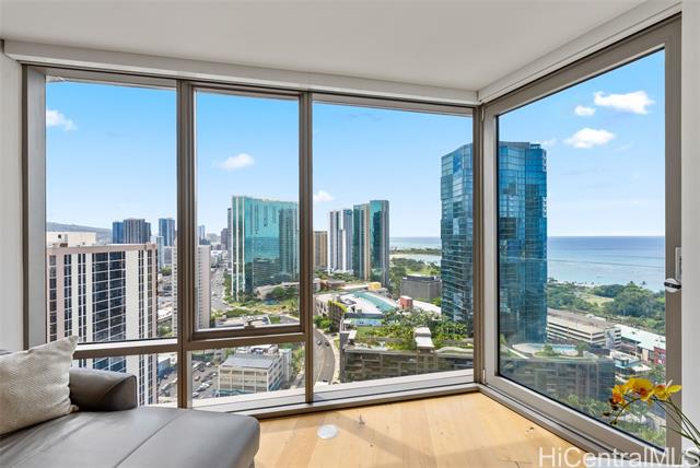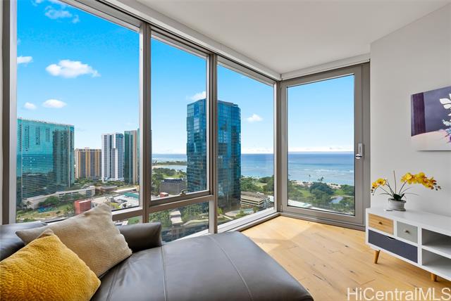 - Welcome to this furnished and rarely lived-in 2-bedroom 2-bath residence in the heart of the thriving Kakaako neighborhood. Situated on the preferred Diamond Head side of Ae’o building, this thoughtfully designed unit features floor-to-ceiling windows boasting stunning ocean, city & mountain views. Its efficient layout, complete with premium Bosch stainless steel appliances, quartz counter tops, motorized shades, hardwood floors, Toto washlet, and the building resort style amenities truly enhance both comfort and privacy. In addition, two assigned parking stalls on the mezzanine level makes shopping at Wholefoods super convenient. Centrally located in the award-winning Ward Village development, you are steps away from shopping, dining, entertainment, beach – all part of Honolulu’s most dynamic and walkable urban community.