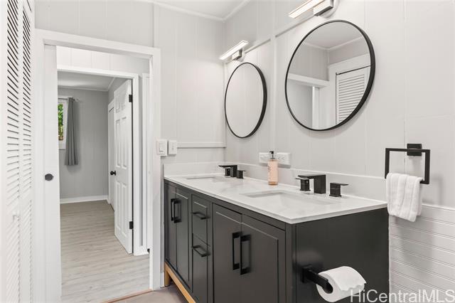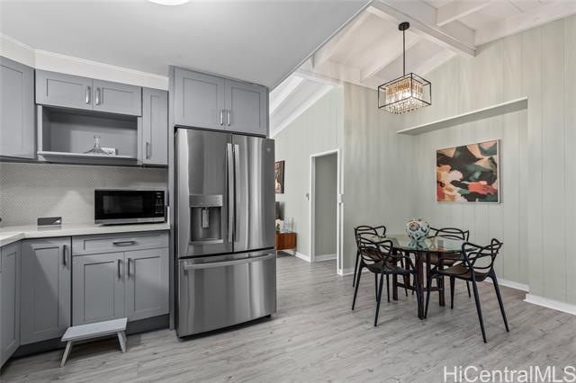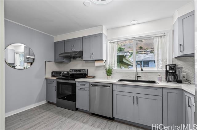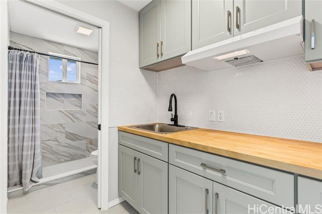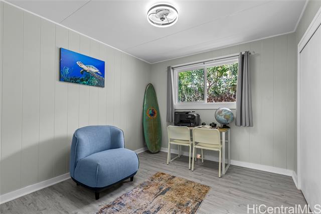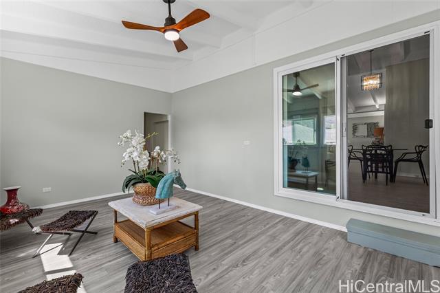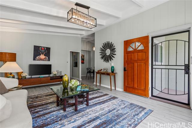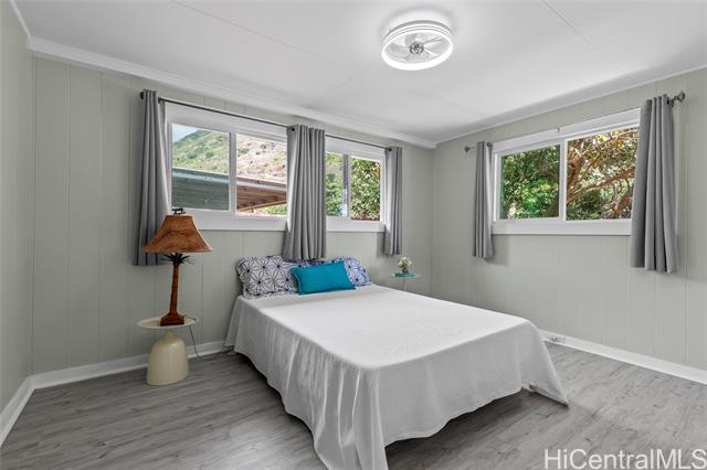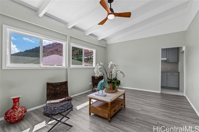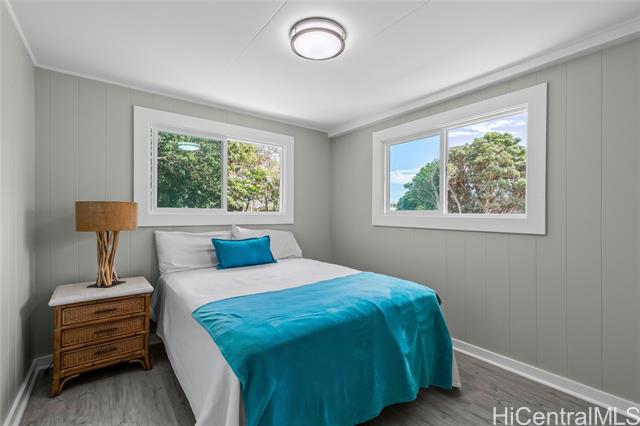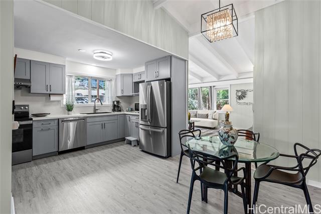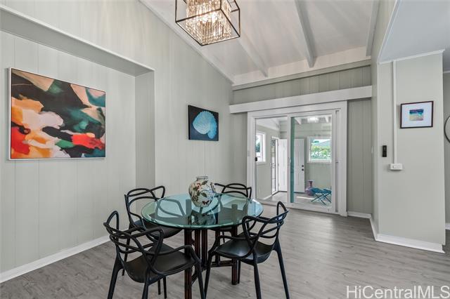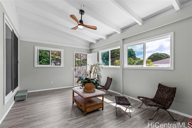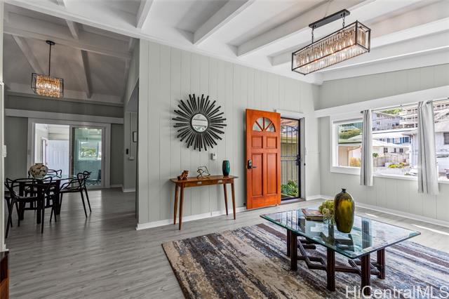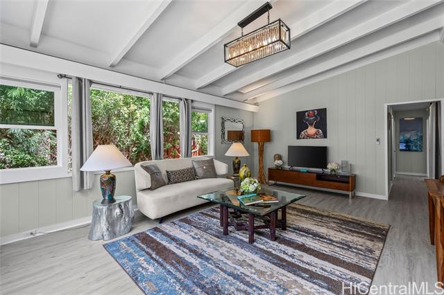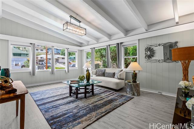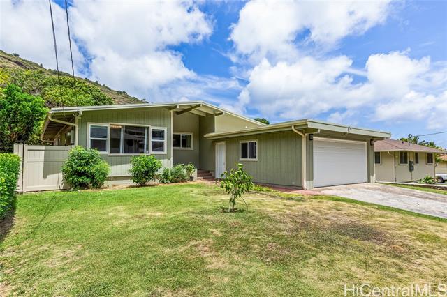 - One level house on a 8,446 Sq. Ft level lot. No stairs to climb. $250k in upgrades and Move-in ready! Located in the highly sought-after Aina Haina, this beautifully renovated home offers the perfect blend of island living and everyday convenience. Fresh new paint on the interior redwood walls. New fence on the property, new luxury vinyl floors, new kitchen, new bathrooms with quartz countertops, new cabinetry and a lovely backsplash. The 1st bath has a modern flare including tile flooring, dual vanities, stylish light fixtures, and a tiled shower with glass sliding doors. The studio just off the kitchen and dining area is perfect for entertaining guests or creating your own home office. It comes with its own wet bar, brand new bathroom, and has a separate entrance. House isn't in a flood zone. Flood insurance is not required. A front yard and a huge backyard oasis that has an avocado & Lychee tree. Perfect for those who love to garden. The backyard has also been encased by beautiful vinyl fencing and a gated entrance on each side of the home. Spacious 2-car garage with new washer & dryer. Do not miss this opportunity to call Aina Haina your new neighborhood!