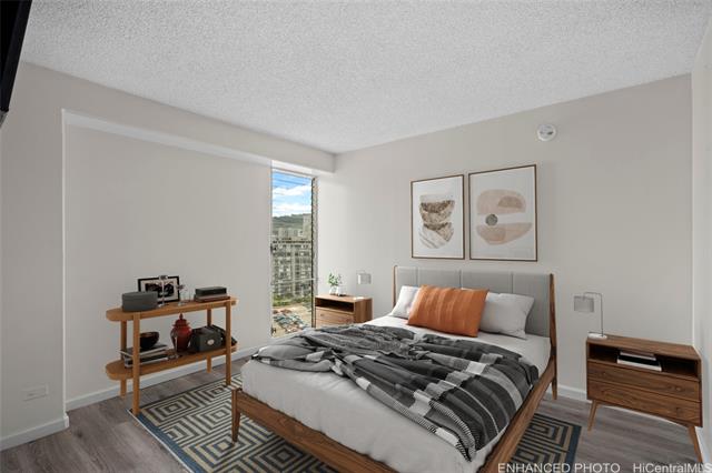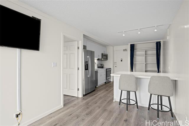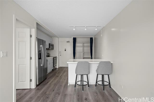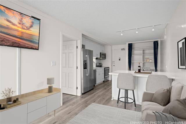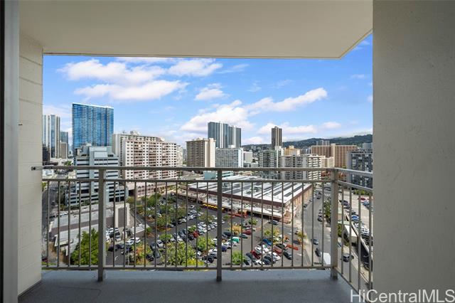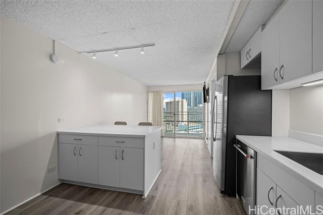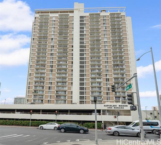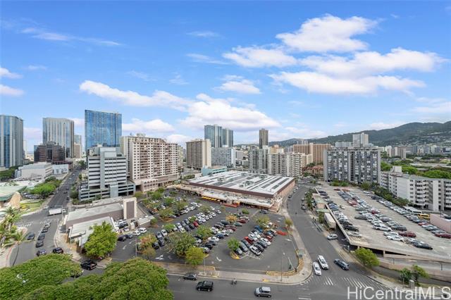 - This beautifully renovated 1-bedroom, 1-bathroom condo combines modern style, comfort, and unbeatable convenience. Fully updated in 2022, it boasts sleek vinyl flooring and a rare kitchen island—perfect for added storage and entertaining—along with a built-in dishwasher, a valuable upgrade in this building. The bathroom features a walk-in shower and mirrored medicine cabinets. Step out onto your private lanai and take in the vibrant energy of the city. Additional highlights include a covered assigned parking stall in a secure garage and a dedicated storage locker conveniently located right next to your parking space. Enjoy access to rooftop amenities including a pool and lounge with stunning panoramic ocean, mountain and city views. Laundry facilities on every floor for your convenience. Ideally situated across from Don Quijote, close to Palama Market, Ala Moana Center, famous beaches, and a variety of local restaurants. The monthly maintenance fee covers electricity, water, sewer, internet, trash, and other common expenses—making it easier to manage your monthly budget. This property is being sold AS IS. Buyers and their agents are encouraged to conduct their own due diligence.