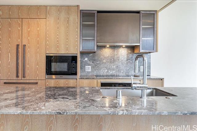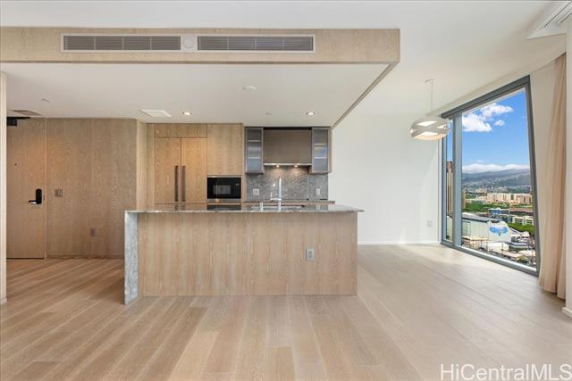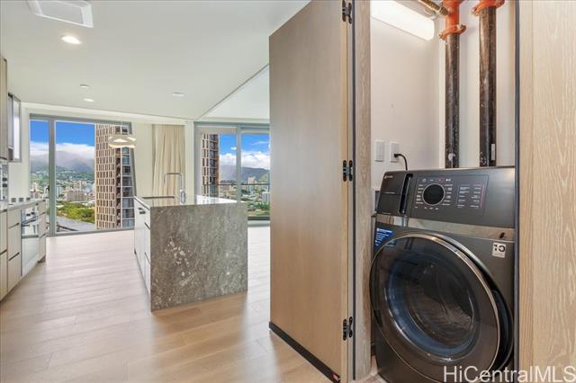 - $5,000 Credit for Buyers Closing costs! Desired corner-end unit with two lanais facing the mountain and Diamond Head side, offering great cross ventilation and beautiful views! Unit features designer wallpaper accents in living room and bedrooms, motorized blinds, Toto Bidet washlets, new ceiling fan & light system, new All-in-One Washer and Dryer system and more! Ko’ula has beautiful resort style amenities including large lap pool, dual jacuzzi's, saunas, BBQ and BBQ pavilions, billiards table, indoor and outdoor entertainment rooms w/ full kitchens & catering access, guest suites, grand lanai with lounge seating, indoor/outdoor fitness areas, playground, 24-hr security and more! Conveniently located within close proximity to a variety of entertainment, shopping, and dining options, along with easy access to Victoria Ward Park, Kaka'ako farmers market, and Ala Moana Beach Park. Second Full Size Parking space being leased which may be assignable to new owner.