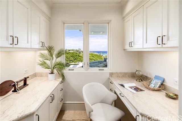 - Wake up to the shimmer of the Pacific and the quiet prestige of Diamond Head. Thoughtfully designed by award-winning architect Jeff Long, this steel-frame, 3-story residence blends architectural brilliance with relaxed island luxury—just three blocks from the beach. Soaring windows frame ocean views from Black Point to Koko Head, while sculptural spiral staircases and Juliette balconies bring artistry and flow. Inside, the flexible layout offers 3 bedrooms, 4.5 baths, and a private study that can serve as a 4th bedroom. The lower level flows out to the pool and garden and offers space for a gym, wellness retreat, creative studio, or flexible guest use—complete with separate entry, wet bar, bath, and laundry. A gourmet kitchen, custom walk-in closet, updated AC systems, and a calming poolside area complete this private retreat in one of Honolulu’s most iconic neighborhoods. Timeless by design. Iconic by address.