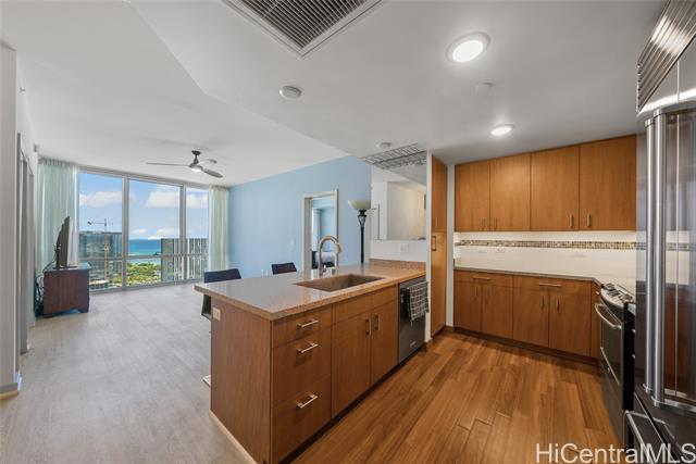 - NEW PRICE! Priced Below Assessed Value! Experience elevated island living in this stunning high-floor residence in the heart of Kakaako. Just one floor below the penthouse, this spacious 2-bedroom + den, 2-bath unit offer the best value in the building. Enjoy sweeping ocean and city skyline views from the cooler, more private side of the building. With soaring ceilings and abundant natural light, this home exudes a tranquil, airy ambiance. Thoughtfully upgraded with high-grade laminate flooring, Sub-Zero refrigerator, elegant chandelier, closet organizers, ceiling fans, and double curtains. The flexible floor plan features split bedrooms for added privacy and a versatile den—ideal as a dining area, home office, or reading nook. The generous primary suite includes a walk-in closet. Enjoy two secured covered parking stalls and access to resort-style amenities: heated saltwater pool, hot tub, gym, playground, BBQ areas, and more. This pet-friendly building also offers bike and surfboard storage. Conveniently located near Down to Earth, SALT at Kakaako, local eateries, and Downtown Honolulu.