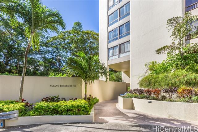- Welcome to this well-maintained 1-bedroom, 1-bath condo in the highly desirable Nuuanu Brookside. Your own serene treetop retreat in the Heart of Honolulu. Lanai oriented to the East for the morning sun. Enjoy the convenience of 1 assigned parking stall in a secured garage, plus the peace of mind provided by 24-hour security in a secure, well-managed building. Nuuanu Brookside is a well-known building with professional-looking landscaped grounds, inviting lobby area and peaceful pool. Call your favorite Realtor today for a walk through. 100% hurricane coverage per insurance agent. Seller in the process of replacing carpet but open to flooring credit at closing.