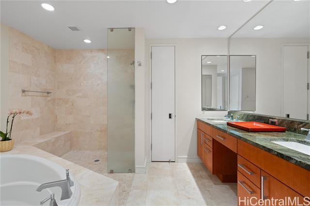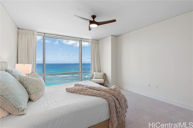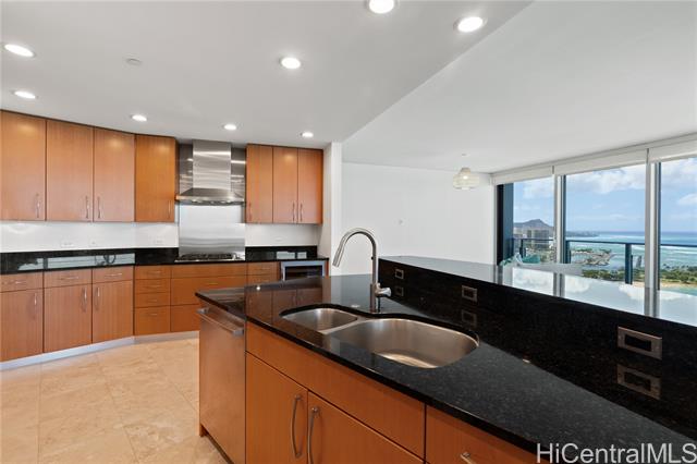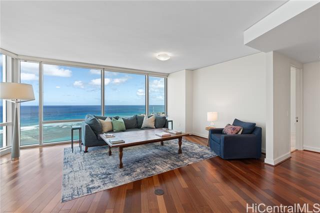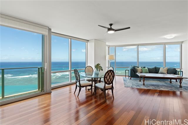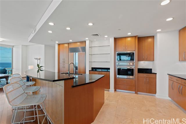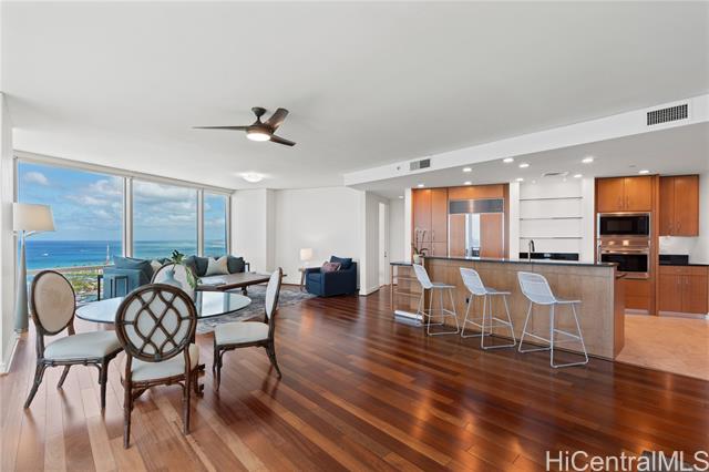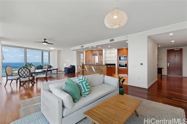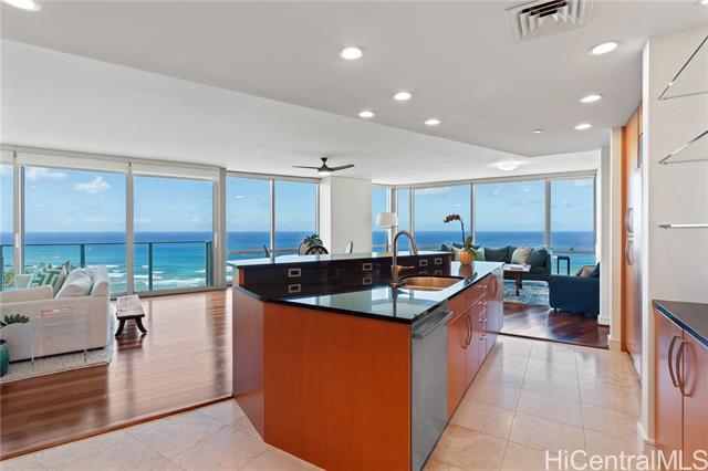 - Gorgeous Sweeping Views from Diamond Head to the Ewa planes. Most desirable 'D' floor plan with 3 parking stalls, a large storage room, very spacious living areas, laundry room, and a wide open kitchen with unobstructed ocean views. Large soaking tub, granite counters, Wolf & SubZero appliances, a duo-zoned wine cooler and gas range. Large primary closet with an organized closet system. Also included are stunning solid Brazilian Cherry hardwood flooring. Hokua is an amazing place to call home. Amenities galore, heated pool, world class gym, BBQ cabanas, tennis and so much more.