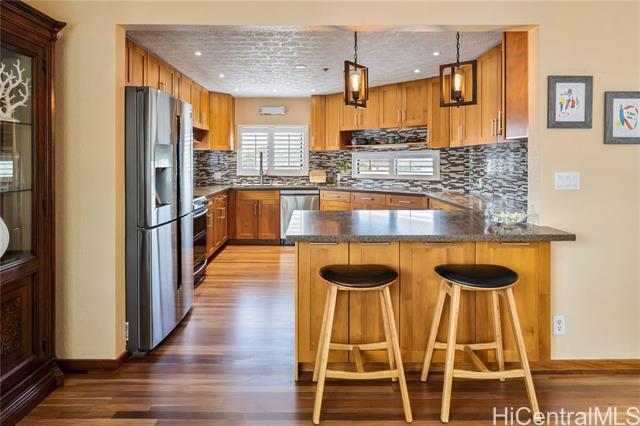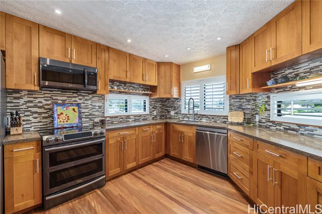 - Situated in a prime location, this freshly painted home is just a short distance from the main street, with easy access to charming cafes, great restaurants, and essential shops. Despite the convenience, the home offers a peaceful and private environment with no through-traffic and minimal outside noise. The remodeled kitchen provides ample cabinet space and a spacious layout, while the remodeled bathrooms add a modern touch. The house enjoys a nice breeze throughout the day, often making air conditioning unnecessary. It features two convenient laundry rooms on both floors and an extra room downstairs perfect for a home theater or entertainment space. Solar panels and backup batteries help keep electricity costs low, adding to the home’s energy efficiency. Beautiful wooden shutters are featured throughout the home, offering both style and functionality. From the front porch, enjoy breathtaking sunrises and sunsets overlooking Diamond Head Crater. This combination of convenience, tranquility, and thoughtful upgrades makes it an ideal place to call home.