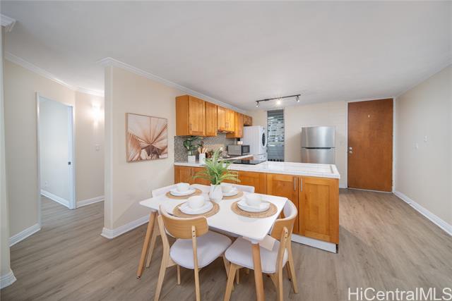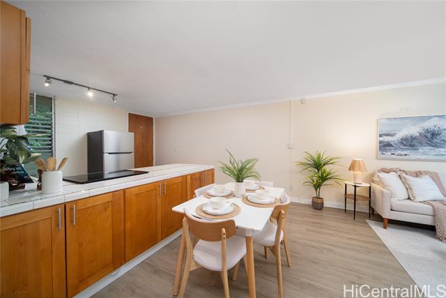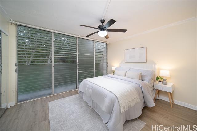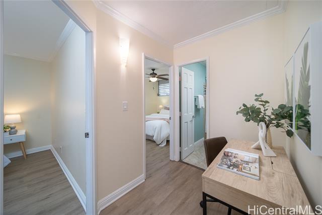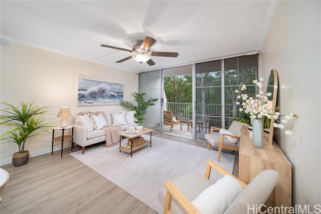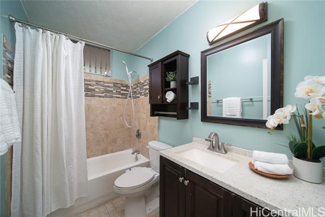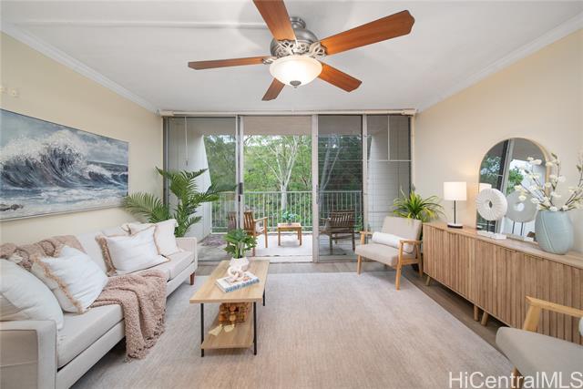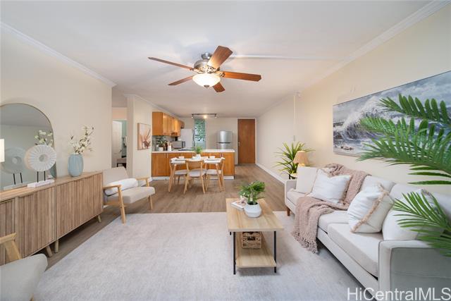 - Stylish 2BR/1BA in desirable Mililani, featuring an airy open layout, sleek ceramic tile floors and luxury vinyl plank flooring, and a private lanai with tranquil tropical views. Two covered stalls plus guest parking. Resort-style amenities include pool, playground, basketball court, and rec area. Prime location near shopping, dining, top schools, Wheeler & Schofield.
