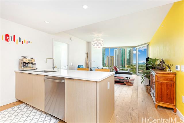 - Experience the urban luxury at Ae'o in the vibrant Ward Village! This stunning 2-bedroom, 2-bathroom unit showcases ocean and city views, two parking stalls (tandem), and a dedicated storage locker-perfectly positioned in front of your EV charger for ultimate convenience. Step inside to a thoughtfully designed layout with bedrooms on opposite sides of the living area for maximum privacy. The primary suite features an enclosed walk-in closet, while the gourmet kitchen is a chef's dream with sleek quartz countertops and top of the line Bosch appliances. Live where everything is at your fingertips-enjoy direct access to Whole Foods Market, and walk to Ala Moana Beach Park, world class shopping, dining, and entertainment. Ae'o resort style amenities include: Sky Terrace, two pools, sauna, private screen theater, fitness center, dog park, BBQ cabana, playground, and guest suites. VA Assumable Loan Available with 2.25% interest rate. Please see agent remarks.