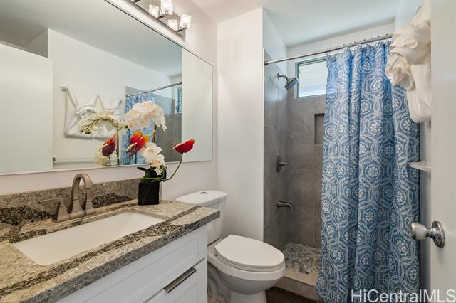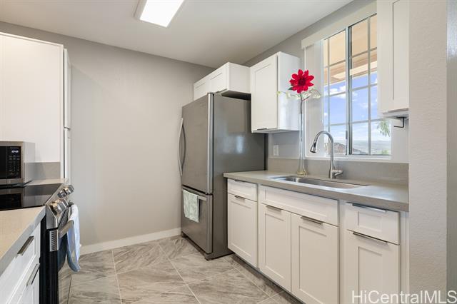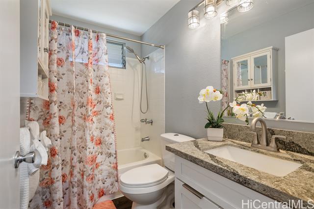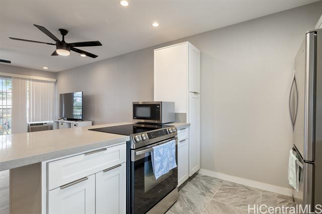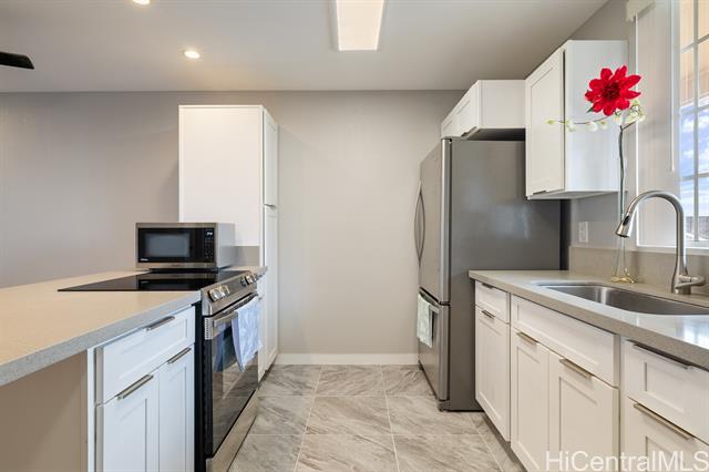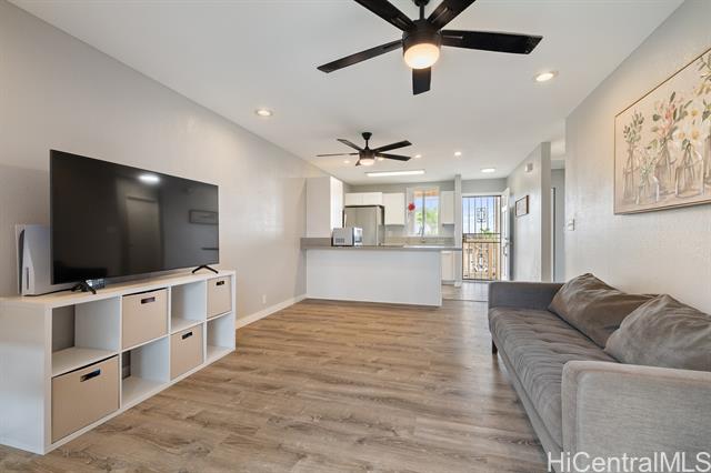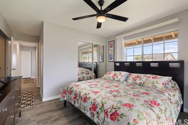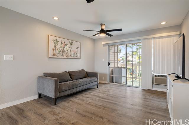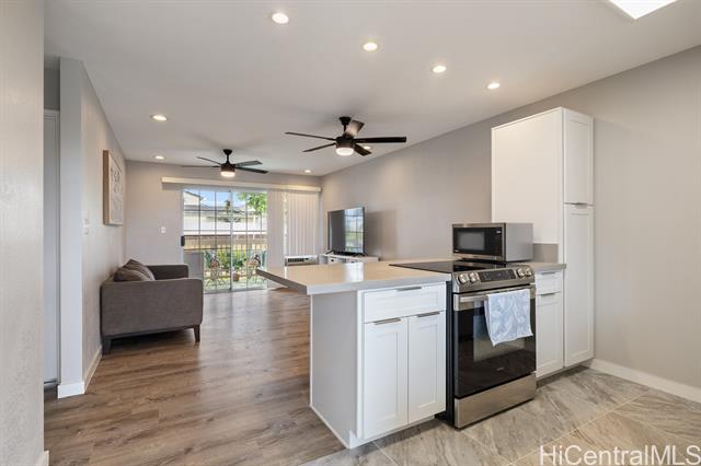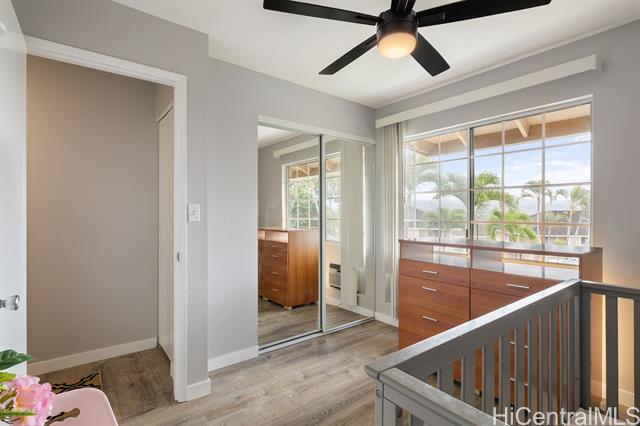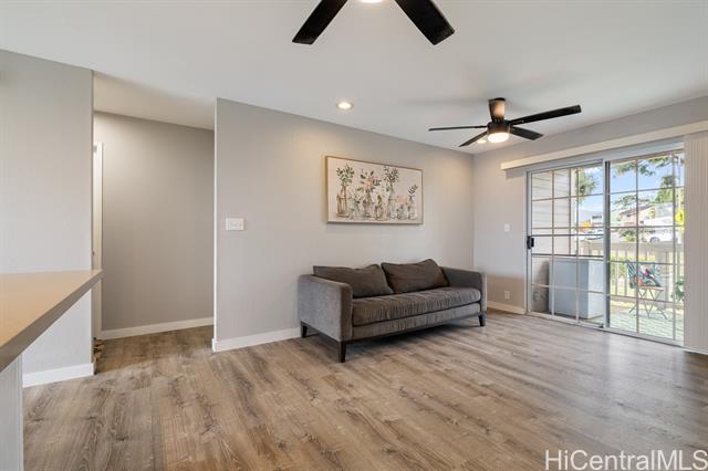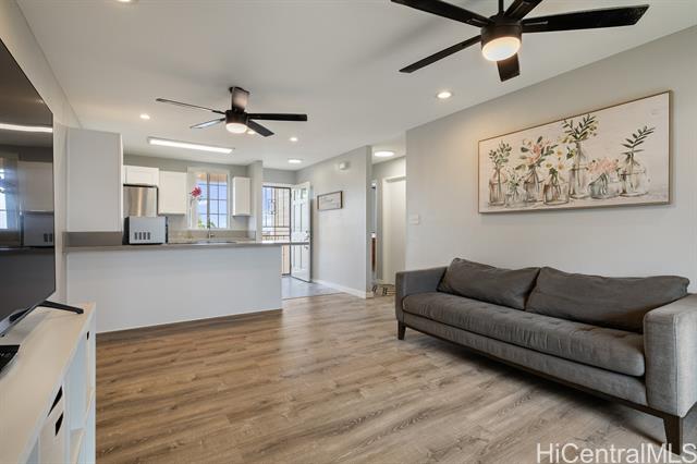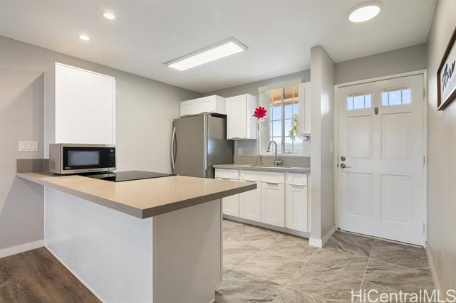 - Fresh two-bedroom, two-bath upstairs townhouse in desirable Waipio Gentry. Features include luxury vinyl and ceramic tile flooring throughout, recessed lighting, brand-new ceiling fans, and a gourmet kitchen with an elegant peninsula, modern appliances, and custom cabinetry. The heart of the home features a spacious kitchen peninsula that comfortably seats 4–5 people—perfect for casual dining, morning coffee, or entertaining guests. This versatile space flows seamlessly into the living area, making it easy to cook, connect, and gather. Both bathrooms have been stylishly updated, and the popcorn ceilings have been removed for a modern, clean look. One assigned parking stall is included, with ample guest and street parking nearby. Conveniently located close to Waipio Shopping Center, Waikele Outlet Stores, dining, parks, and schools.