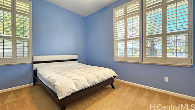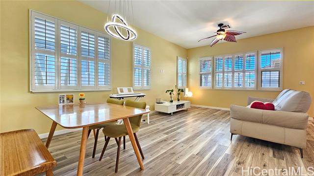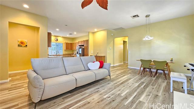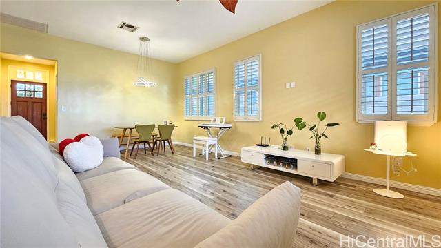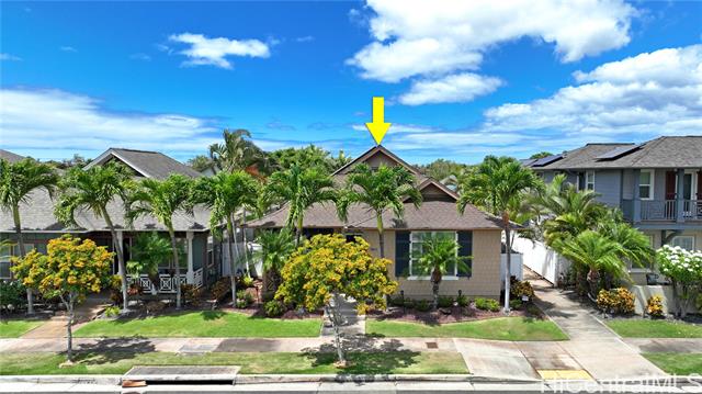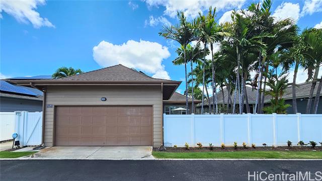 - 91-1022 Waillikahi Street in Ewa Beach is a beautifully maintained single-level home located in the highly desirable Hoakalei – Ka Makana community. This thoughtfully upgraded residence features soaring high ceilings, a bright open layout, and a landscaped garden with an automatic sprinkler system for easy care. The home is equipped with 24 owned solar panels, significantly reducing electricity costs and adding long-term value. Additional improvements include new living room flooring and molding, a freshly painted interior and exterior, and a new water heater with PV panel. The kitchen offers a new microwave and garbage disposal, while the bathrooms showcase a sleek glass shower enclosure, modern fixtures, and updated lighting. Comfort is assured with central A/C that was fully serviced in April 2025, including replacement of the vent, motor, fan, and capacitor, plus professional coil cleaning. This move-in ready property combines modern upgrades, owned solar, and the convenience of single-level living—all within the resort-style Hoakalei community.