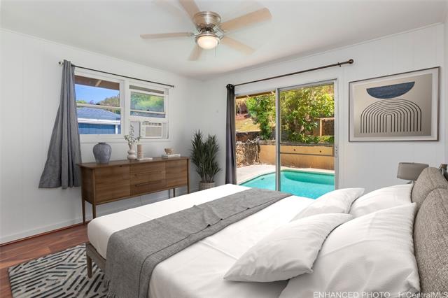 - Amazing opportunity to own in Kailua! This flexible floor plan offers endless possibilities with a well-maintained 4-bedroom, 2-bath main home (currently configured as a 3/1 plus a spacious studio). An additional remodeled studio (5th bedroom), separated by the saltwater pool, enjoys treetop and mountain views of Enchanted Lake, along with cool breezes and privacy. Ideal for multigenerational living, a home office, or rental income potential. The property is fully fenced and landscaped with a sprinkler system—perfect for your fur babies! Conveniently located near world-famous Kailua beaches, parks, shops, and restaurants, with easy access to the H-3 and Pali Highway—without having to fight traffic in Kailua town. Put this home on your must-see list! Number of bedrooms differs from tax records. One or more photos have been enhanced.