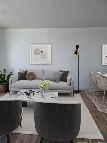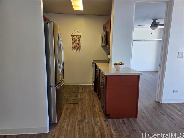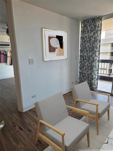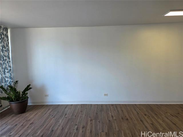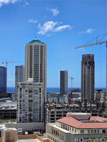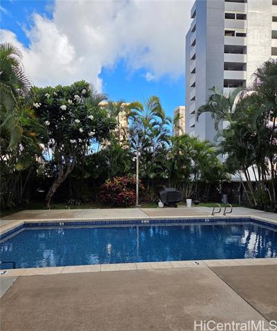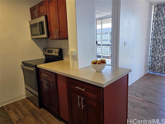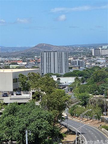 - This lovely, corner end, one-bedroom, one-bath unit features a lanai extending from the living room to the bedroom. City and skyline views of mountain and ocean. If location matters, enjoy easy, close proximity to H-1 access, convenient bus line route, Neal Blaisdell Center, Thomas Square Park, Honolulu Museum of Art, Open Market on Wednesdays at the Neal Blaisdell Center grounds, Ala Moana Shopping Center, Kaka'ako restaurants, University of Hawaii, and more. The property was previously renovated in 2021 to include cherry cabinets, Quartz countertops, a new sink, and stainless steel appliances in the kitchen. Updates also included a new bathroom vanity, sink, faucet, washer/dryer, toilet and mirror. Newer refrigerator 2024. New laminate flooring in the living room kitchen and bedroom. Bathtub was nicely reglazed. There is one assigned, compact, covered parking stall. A convenient Mini Mart is also located on the ground floor. As-is condition, no repairs, but Buyer will receive a one year warranty from America's Preferred Home Warranty upon closing.