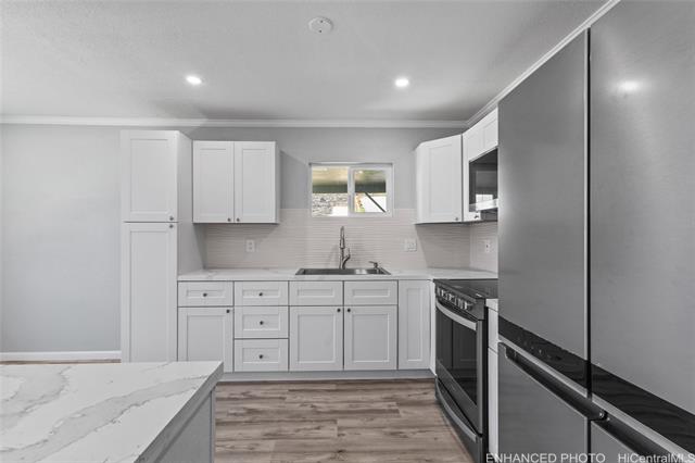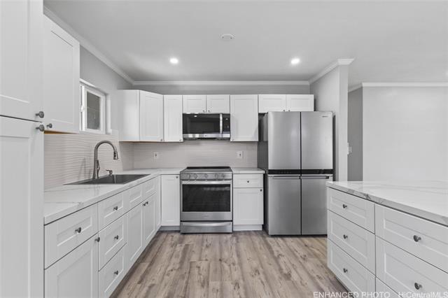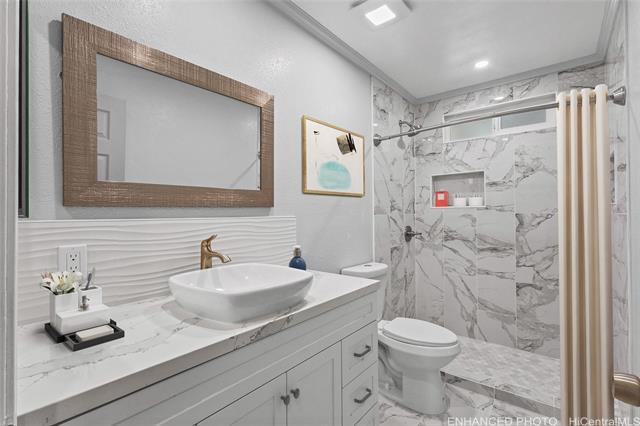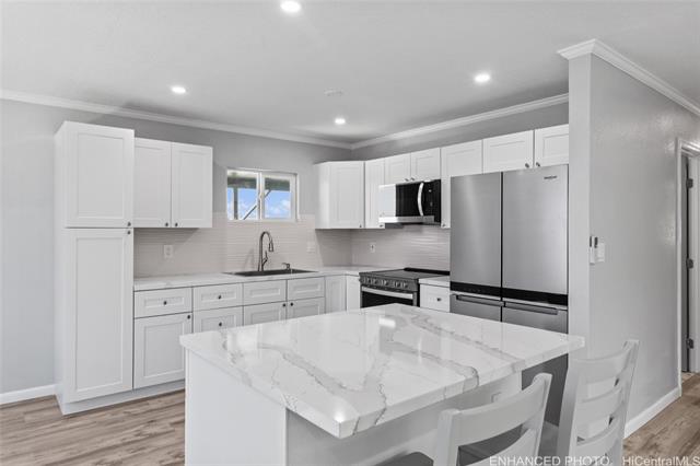 - Gorgeously Renovated Makaha Home ! Welcome to this beautifully renovated 3-bedroom, 1.5-bath detached single-family home on the desirable Manuku Street in Makaha. Recently updated from top to bottom, this home offers a bright and open living and dining area centered around a modern kitchen island. The kitchen has been upgraded with white quartz countertops, while luxury vinyl plank flooring runs throughout the main living areas, bedrooms, and half bath. The main bathroom showcases ceramic tile flooring, a new vanity and cabinetry, and a stunning floor-to-ceiling tiled shower with all-new fixtures. Both bathrooms and the kitchen have been refreshed with stylish, modern finishes. Additional highlights include recessed lighting, a newly installed split A/C system, fresh interior and exterior paint, and brand-new vinyl windows designed to keep the home cool and energy efficient. Located just minutes from world-famous Makaha Beach, Aki’s Beach, and the breathtaking Yokohama Bay, this home offers the perfect blend of comfort and island living. Come experience all that West O?ahu has to offer—including the unforgettable sunsets it’s known for.