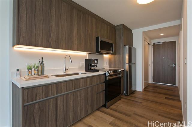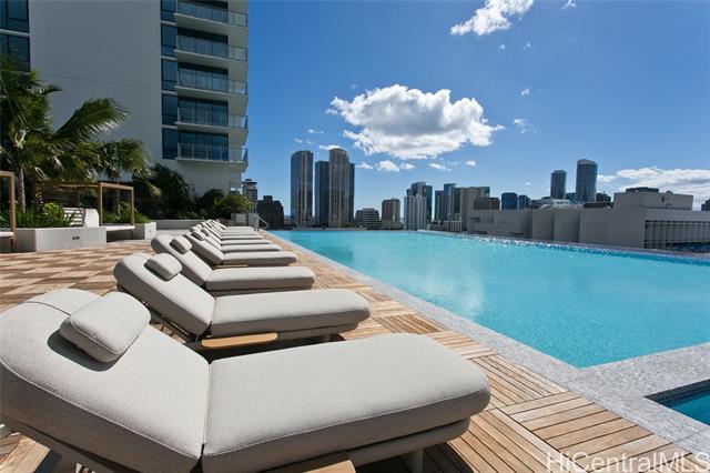 - Price reduction-This brand-new, never-lived in high-floor studio offers 353 sq. ft. of interior space plus a 63 sq. ft. lanai, totaling 415 sq. ft.(larger studio) The home feels spacious and versatile, with sweeping views of the mountains and city. Located in the Liona Tower at the Park on Keeaumoku, you'll be in the heart of Honolulu-just minutes from Ala Moana Center, Ala Moana Beach, Sam's Club, and Walmart, with easy access to Waikiki, Kaka'ako, major bus routes, and bike paths. Inside, you'll find modern finishes, quartz countertops, energy-efficient appliances, and split A/C for year-round comfort. Floor-to- ceiling windows flood the interior with natural light, seamlessly blending the living space with the oversized lanai. Enjoy resort-style amenities including an infinity pool, spa, fitness center, co-working lounge, movie theater, BBQ pavilions, and a private central park. Don't miss this one-of-a-kind opportunity to own in one of Honolulu's most exciting new developments. Why rent if you can own. Three photos were virtually staged.