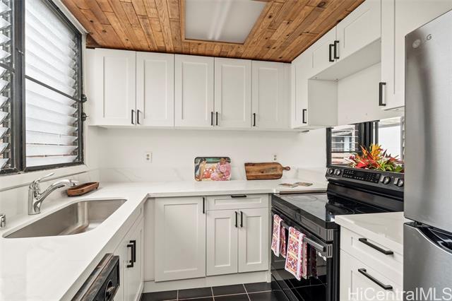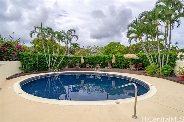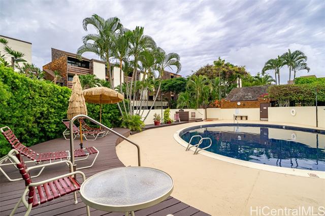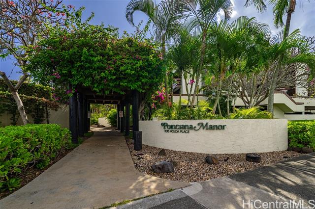 - Bright and Airy! Top floor end unit with a garden view! Two lanais, cathedral ceilings, and two covered parking stalls. Convenient location in the heart of Kailua, close to shopping, restaurants, and schools. Poinciana Manor offers well-kept common areas, a pond with a water feature, a pool, a recreation area, a BBQ area, and guest parking. The sale is As-Is.