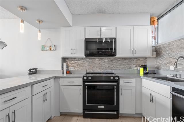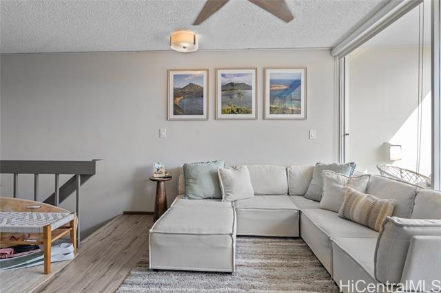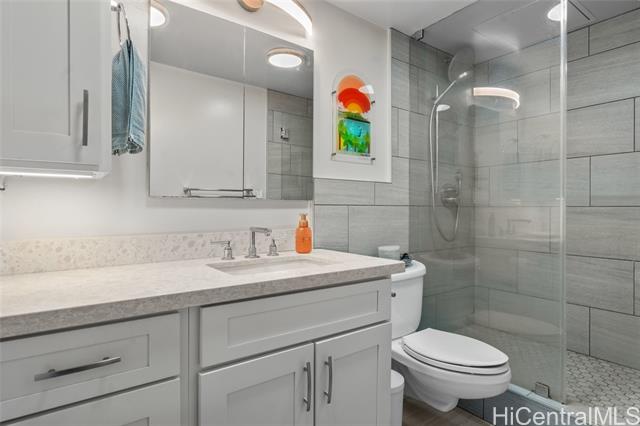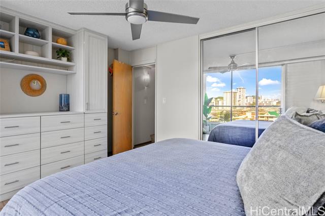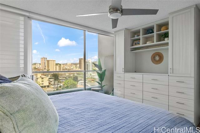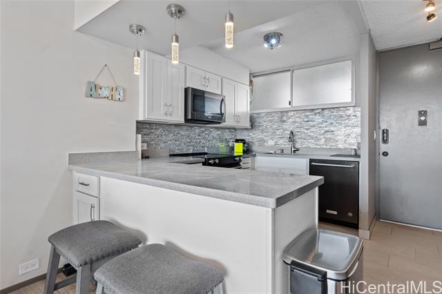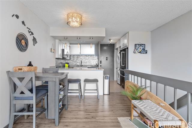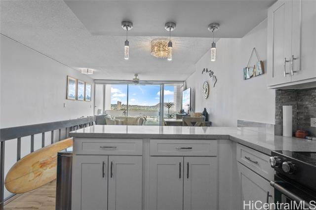 - Experience the ultimate comfort in your newly renovated split-level home featuring lanais on both levels, offering breathtaking views of Diamond Head that span from the lush mountains to the vibrant cityscape. The thoughtfully designed floor plan boasts a spacious living room and kitchen on the main entry level, with the bedroom located on the lower level for added privacy. Recent renovations include luxurious LVP flooring, a fully modernized kitchen complete with a dishwasher, range, refrigerator, quartz countertops, and in-unit washer and dryer. The sleek bathroom and updated plumbing fixtures throughout (including kitchen, bath, shower, toilet, and shutoff valves) ensure modern convenience, complemented by an upgraded electrical panel and custom closet shelving. Ala Wai Skyrise is a secure, well-maintained building that offers amenities such as guest parking, a pool, BBQ area, and an on-site manager. Perfectly positioned near the bus line, University of Hawaii, Iolani School, and other educational institutions, it provides