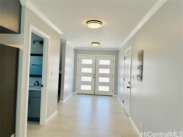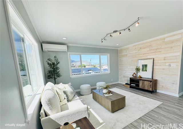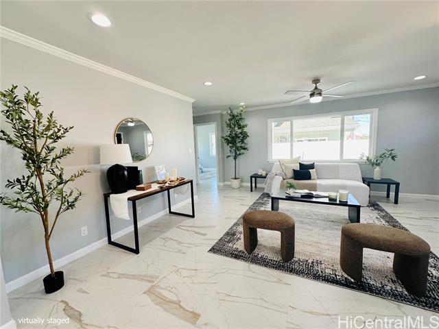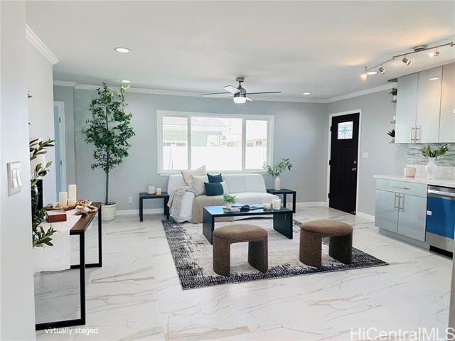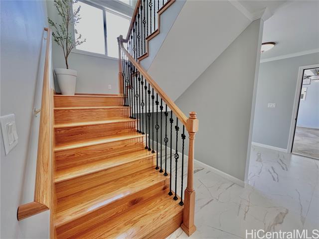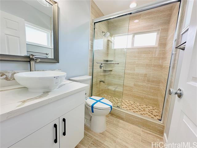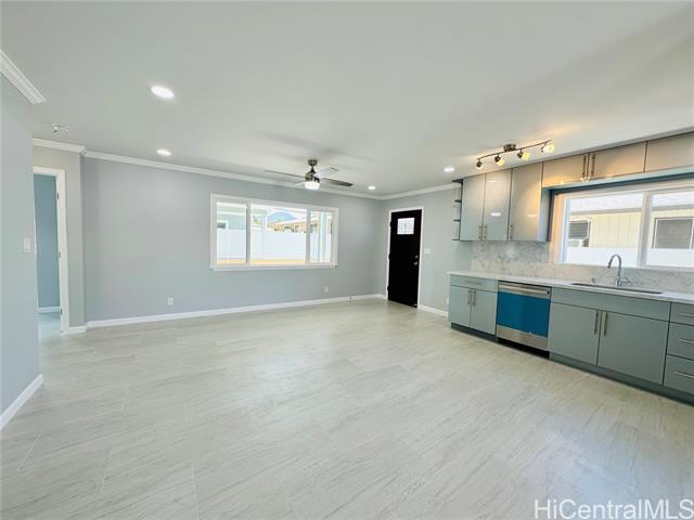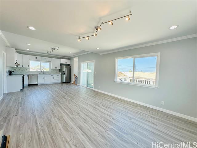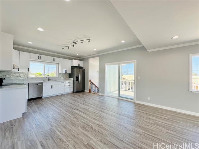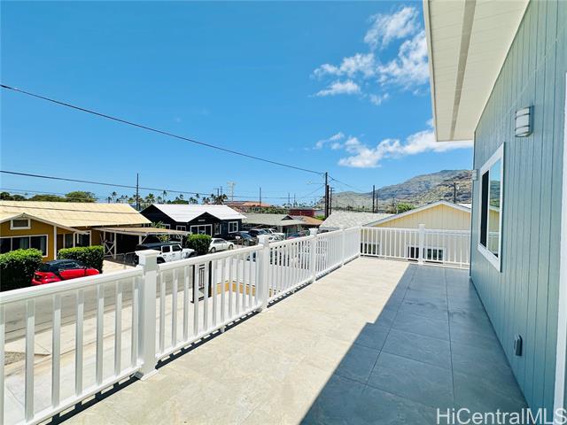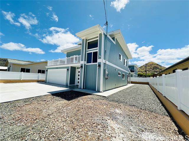 - Stunning brand new constructed and beautifully designed contemporary 2-story home featuring 5 bedrooms, 4 bathrooms & 2-car garage with quality materials and finishes. Highlights include porcelain tiles, luxury vinyl plank flooring, recess lights, beautiful kitchen cabinetry & countertops, split AC, and more. This property offers a flexible floor plan, great for extended family living. Upper level: 3/2 with full kitchen, dining, living room, and a spacious open lanai for unwinding after a long day. Lower level: 2/2 with wetbar, family room, and a covered patio perfect for the backyard BBQ and entertaining. The open-concept kitchen flows effortlessly into the dining and living areas, creating the perfect space for family gatherings and lasting memories. Large spacious yard for entertaining or gardening. Fully fenced with a motorized gate for privacy. Conveniently located near shopping, schools, and minutes away from Pokai Bay Beach Park. CPR with no common area or HOA fees. Property tax not yet updated. OPEN HOUSE, Dec. 7, 2pm-5pm.