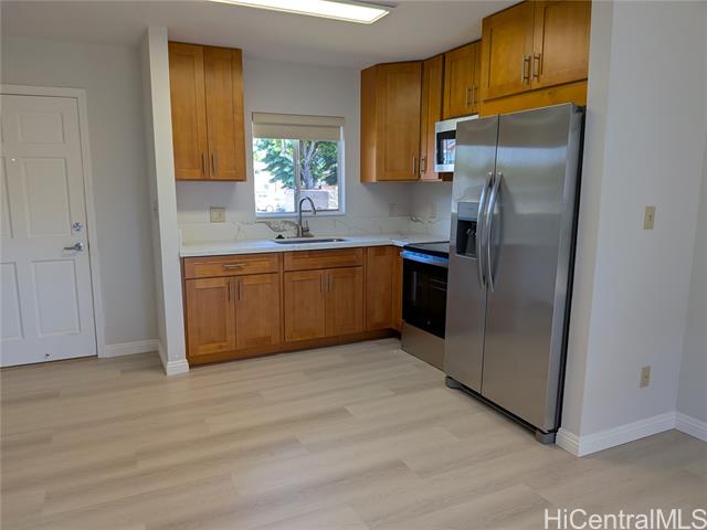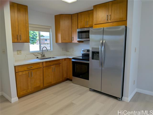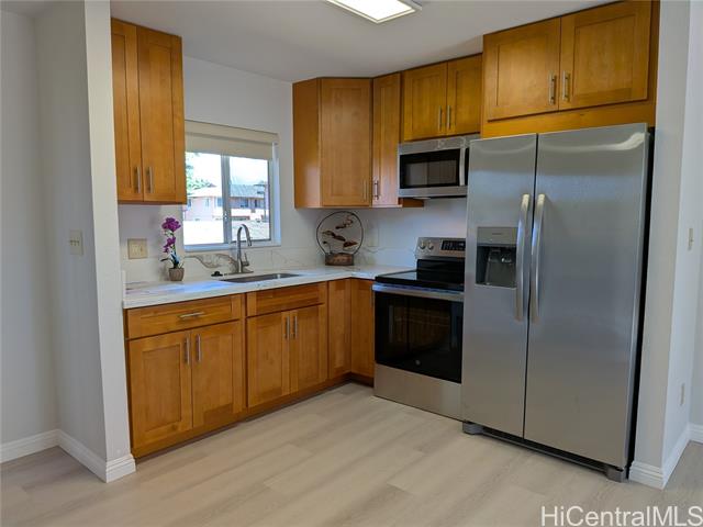 - Great opportunity to own a single level corner end unit with two assigned parking stalls. Unit has been renovated with new kitchen and bath cabinets, granite counter tops, luxury vinyl plank flooring, paint, appliances, toilet and more. Unit is in walking distance to Kapolei Elementary School and Kapolei Regional Recreational Center. Located in the heart of Kapolei with easy access to shopping centers, Costco, Home Depot and numerous restaurants.