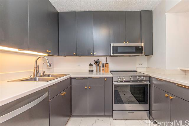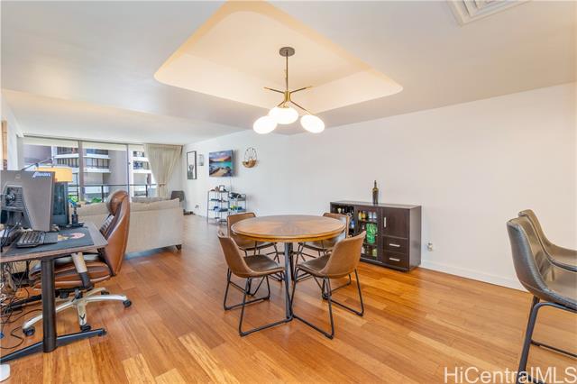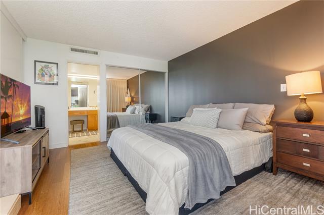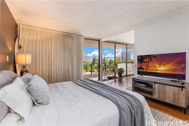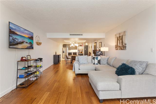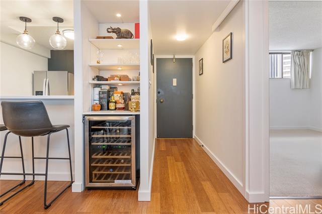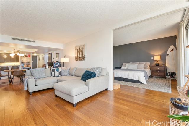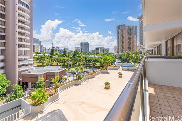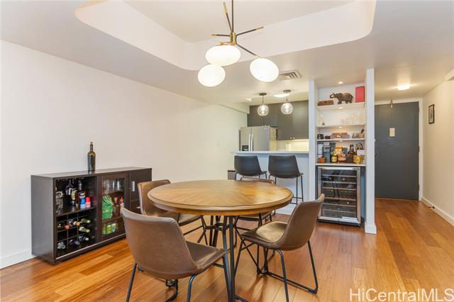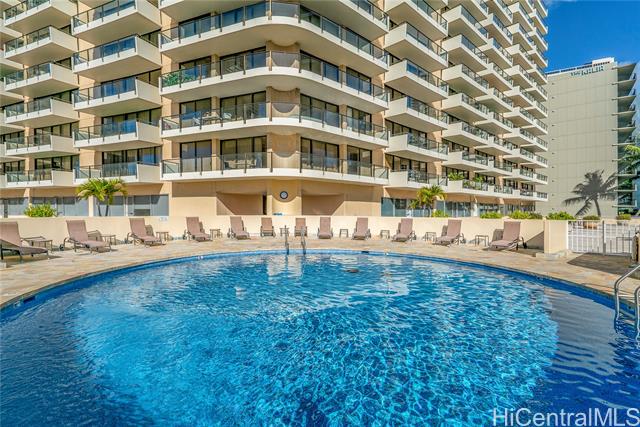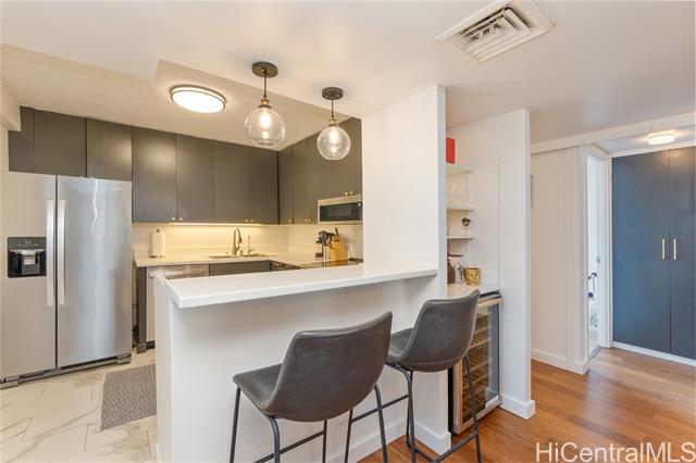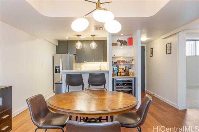 - Beautifully remodeled Wailana residence conveniently located at the gateway to Waikiki! This move-in ready, fee-simple unit features 2 bedrooms, 2 bathrooms, and 1 parking stall. Enjoy fresh air on the spacious lanai with Diamond Head and city views, perfect for relaxing or entertaining. The fully remodeled kitchen showcases upgraded stainless steel appliances, including a wine fridge, solid stone countertops, and opens seamlessly to the bright living area. Central AC unit was replaced in 2022. Elegant hardwood and marble tile flooring throughout add a sophisticated touch. Wailana at Waikiki is a pet-friendly building offering amenities such as a pool, recreation area, secured parking, and extra storage. Enjoy living just moments from world-class shopping, dining, and entertainment, Fort DeRussy Park, beautiful white-sand beaches, and the renowned Ala Moana Shopping Center.