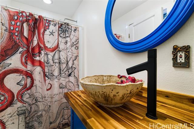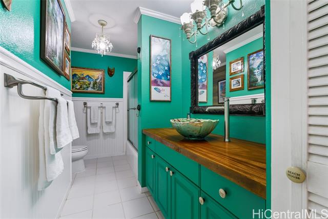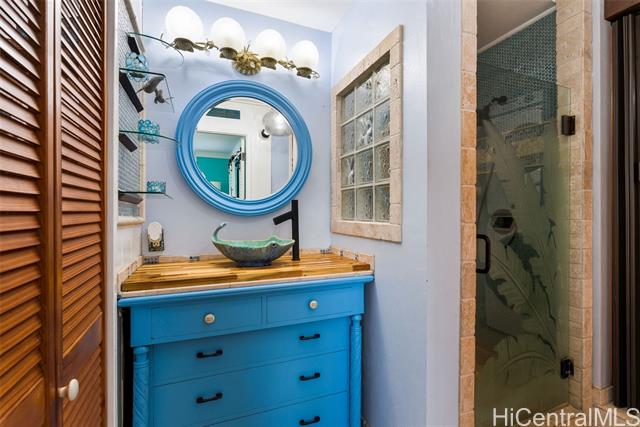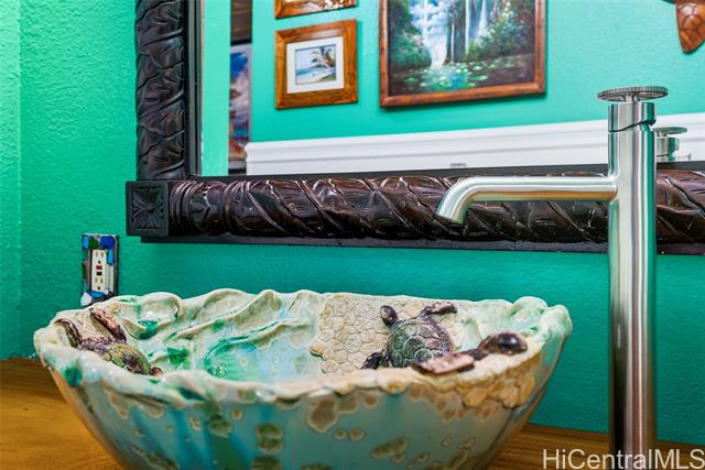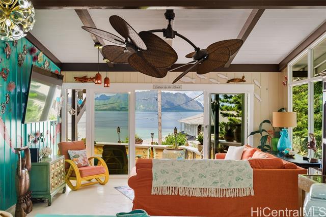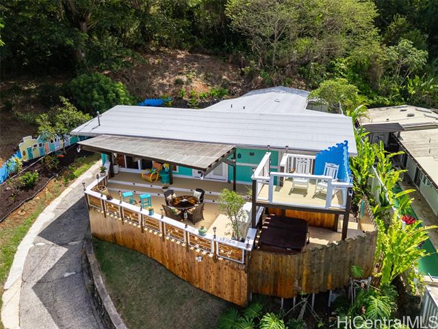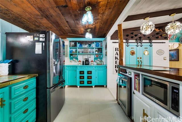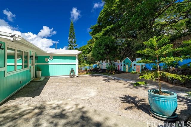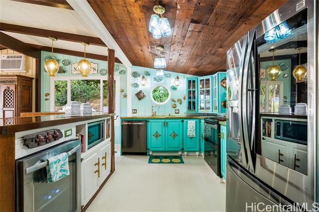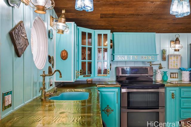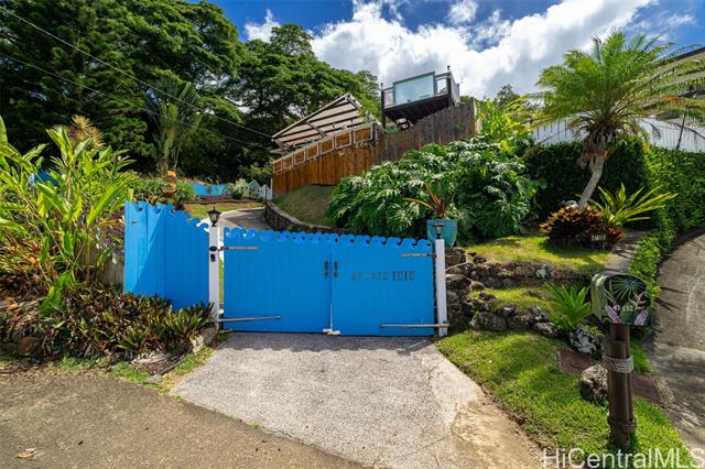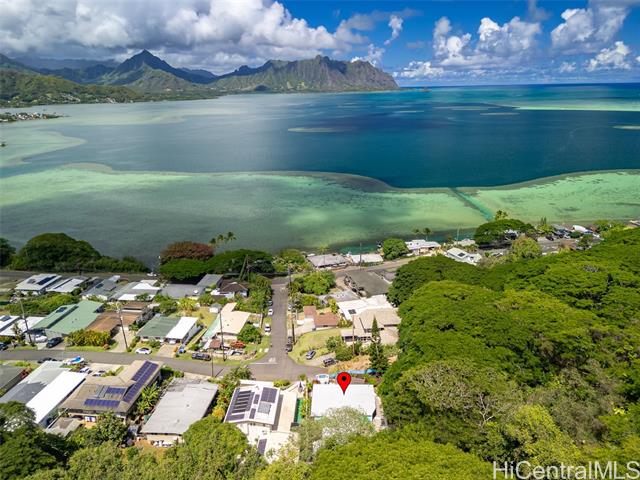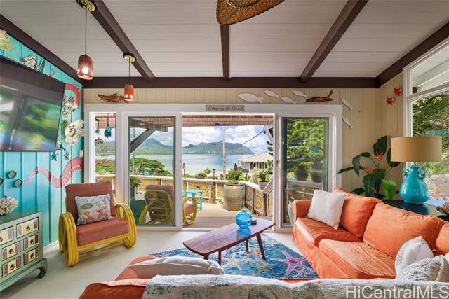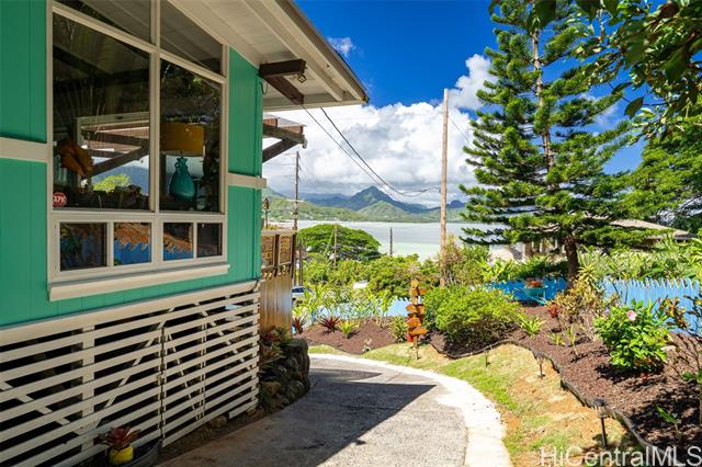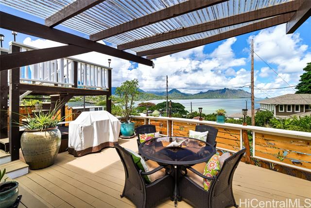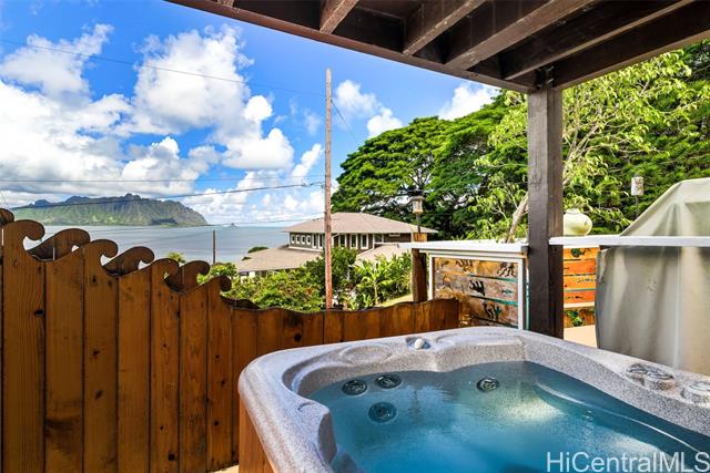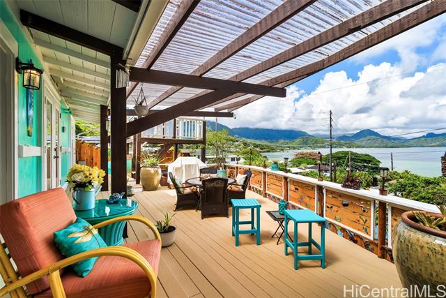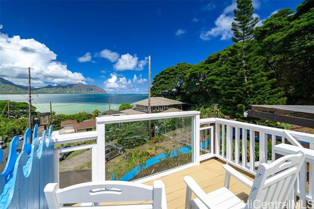 - Artistic and unique island retreat in the sought-after Lulani Ocean neighborhood! Enjoy sweeping ocean/mountain views all the way to Chinaman's Hat from the expansive deck, upper-level crow's nest, or spa overlooking the ocean. There is a plethora of unique fixtures & custom finishes such as the brass w/epoxy kitchen countertops, Ohia posts in kitchen & lanai railings, nautical-inspired designs, antique entryway bricks, wood inlays w/ocean themes, decorative ocean-inspired vessel sinks, etched tropical glass, fun lighting fixtures, and more! Other features include a new roof, newer plumbing & electrical, tankless water heater, kitchen pot filler, two convention ovens, wine/beverage refrigerator, two AC wall units. Bonus items include a dwarf avocado & mango tree plus lush island landscaping. The home backs up to preservation land for privacy & the automatic gate at the driveway, in addition to 8 ARC TV cameras, provide additional security and privacy. This property is colorful, whimsical, & simply full of fun! Don't miss the level of love and attention the owners have put into this property. Just 1/2 miles to He'eia Kea Boat Harbor and minutes to Kaneohe town, schools & freeways.