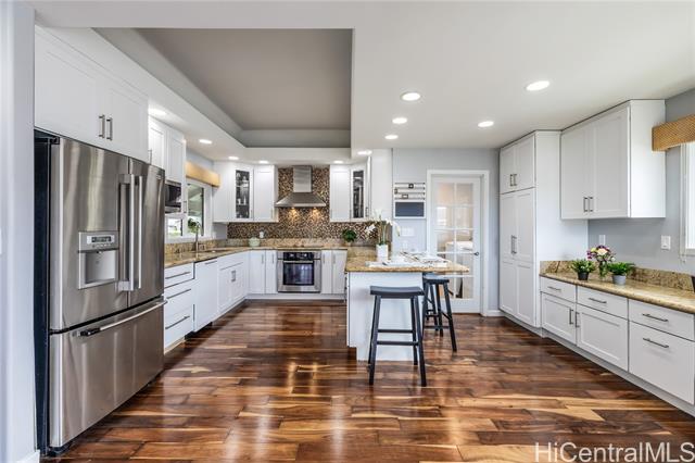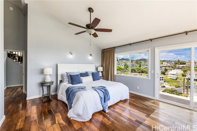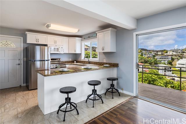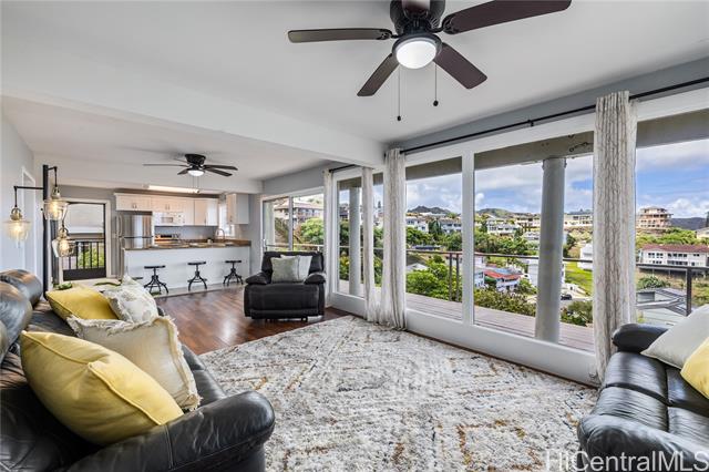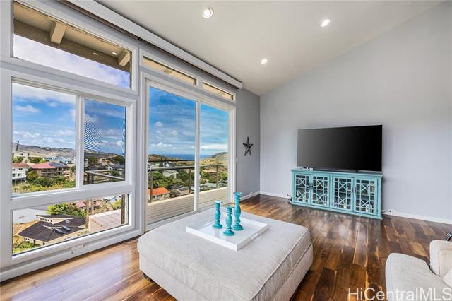 - Perched in a prime location, this home offers ocean and mountain views from multiple decks and perfectly blends modern comfort with classic island charm. The open-concept main level features 3 bedrooms, 2 baths, and an expansive kitchen and dining area that overlook the living room. The living room and primary suite have soaring ceilings and hardwood floors. The primary suite includes a walk-in closet, a luxurious en-suite bath with a soaking tub and walk-in shower, and its own deck overlooking the ocean, perfect for enjoying the sunrise. The two additional bedrooms on this main level have views of the pool, one of which also has a view of Koko Head and opens up to a deck for direct access to the pool, perfect for relaxed island living. The separate lower level offers a living room with equally stunning views, a covered deck, kitchenette with breakfast bar, 2 bedrooms, and a full bath—ideal for guests, a rental, or multi-generational living. (Note: there is no interior staircase connecting the two levels). The main level also has a large attic room with a window view of the ocean, great for storage or a kid's playroom. All that Hawaii Kai has to offer is close by.