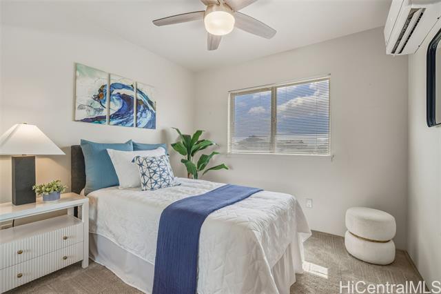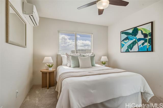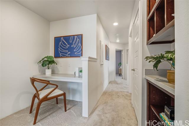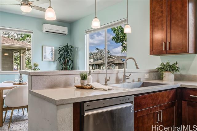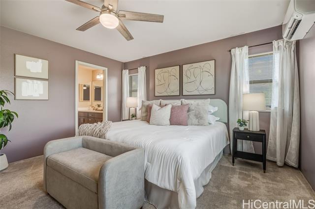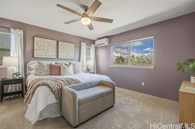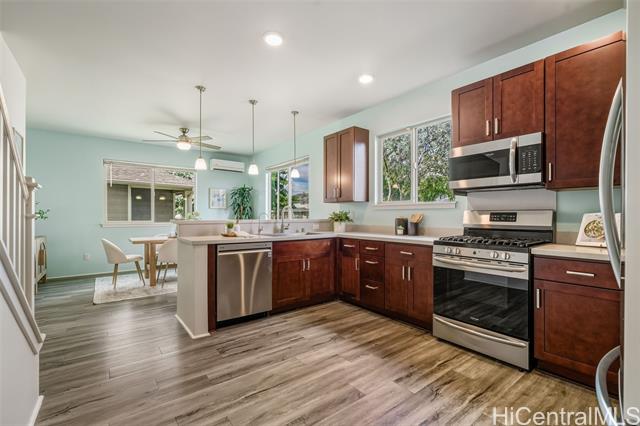 - *30 Owned Solar w/3 Batteries* This well-maintained Grove (Plan 5) is a rare and popular 4 Bed/2.5 Bath single-family home in Iliahi at Hoopili, a fast-growing modern/contemporary design community. This home features a spacious open-concept living/dining room area, a centrally located kitchen w/stainless appliances & GAS range, and raised breakfast bar. The home includes the COOL Package, upgrading the countertops to quartz and flooring to luxury vinyl planks. All bedrooms are carpeted w/split AC units in every room. The home also comes w/fresh paint. The upstairs hallway has a built-in desk and shelves, linen storage closet, and a full 2nd bathroom. In addition, this home has 2 covered lanais, landscaped yard w/an automatic irrigation system and Urban Garden, an attached 2-car garage with a laundry sink and washer & dryer, and an auto garage door opener. The developer also included EV-ready hookups, tankless gas water heater, gas bbq hookup, and Smart Home System. The Ho'opili master planned community includes many parks, playgrounds, urban gardens, shops, dining, and much more! Close to Skyline Rail, beaches, resorts, golf, schools, hikes... Why wait? Schedule a showing today!