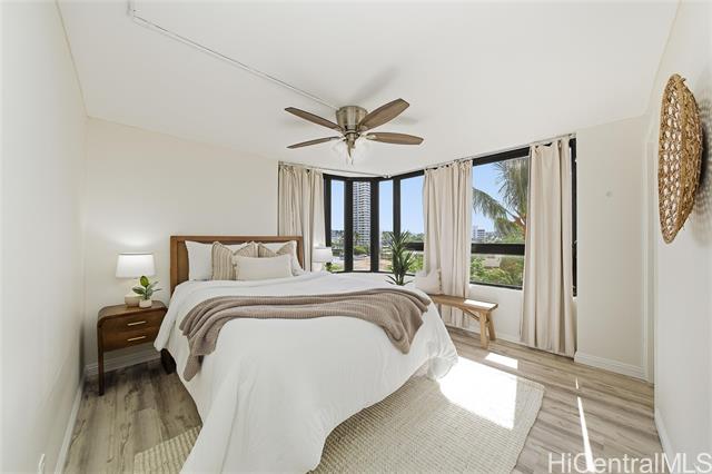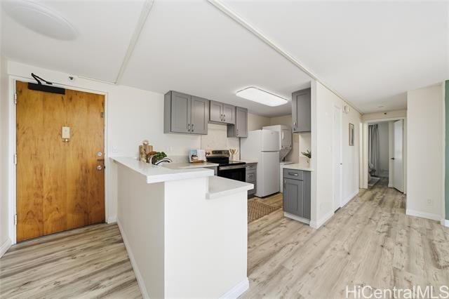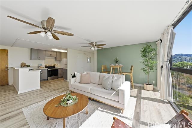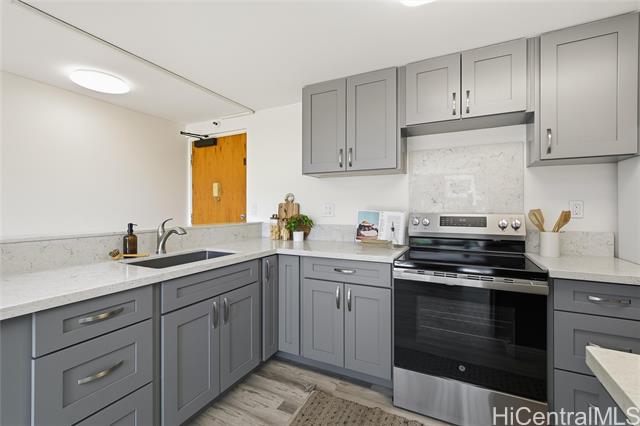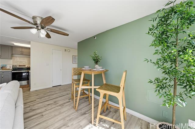 - Location, location, location! Located in the heart of Mo'ili'ili, this 2 bedroom, 2 bath residence in Kings Gate has been completely renovated in 2024 and is ready for you to move in! Step into this bright and updated home with vinyl flooring throughout, and no popcorn ceiling. The kitchen features new cabinetry, quartz countertops and new appliances. Both bathrooms have not only been updated, but the entire buildings plumbing was also recently completed. Both bedrooms also feature closet systems as well as ceiling fans to keep cool air circulating. Conveniently located in the heart of Honolulu, Kings Gate is walking distance to University of Hawaii, coffee shops, local eateries and shopping. Unit comes with 1 assigned, covered parking stall in a secured garage. The special assessment of $207.30 will end Dec 2025.