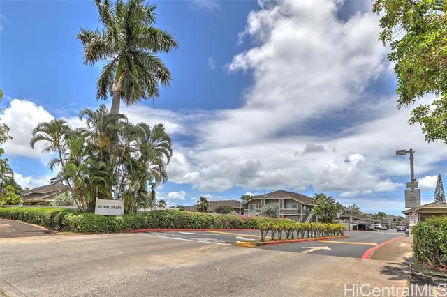 - Take advantage of this opportunity to own this studio unit in the desirable Royal Palm at Waipio! This unique townhouse studio unit has been well maintained and includes a lanai with storage closet, stacked washer/dryer and 1 covered parking! This complex is centrally located near shops, park and restaurants!