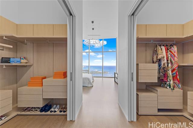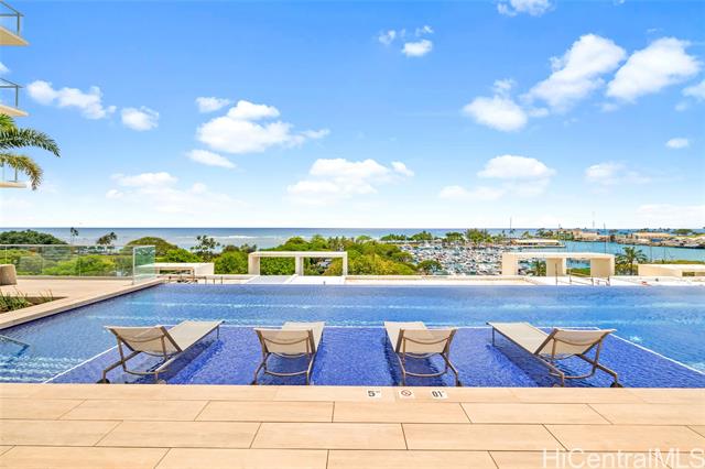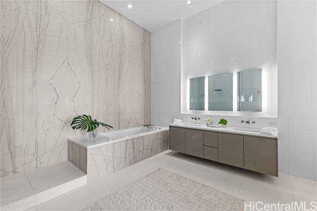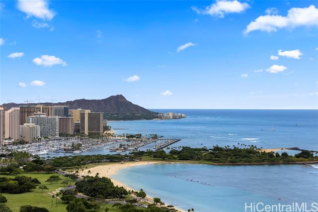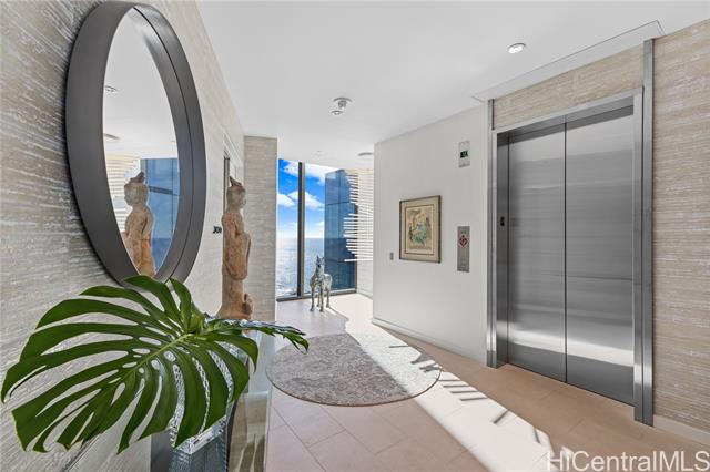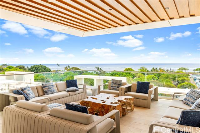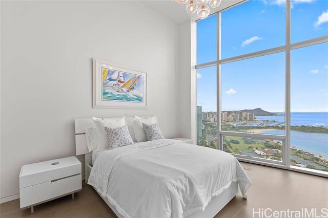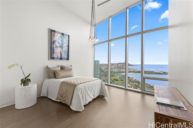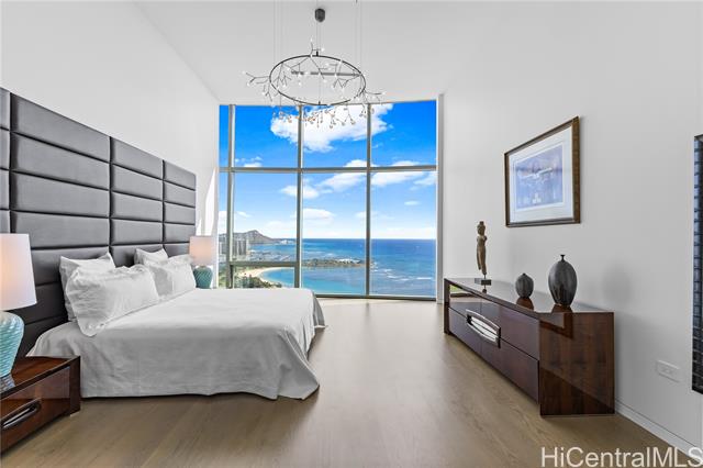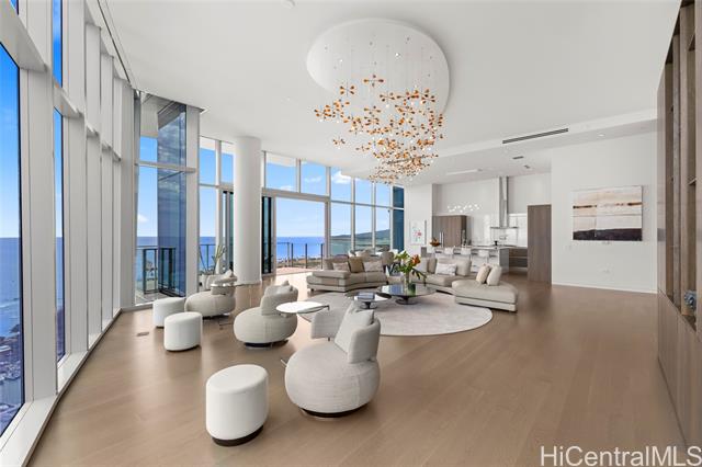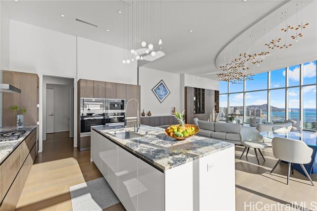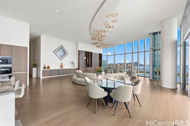- Exceptional offering in Ward Village. Waiea’s Penthouse 3400 commands a breathtaking position where the Pacific, the coastline, and sweeping views of Diamond Head span the horizon. A private elevator and foyer lead into soaring 13.5-ft ceilings and floor-to-ceiling glass framing ocean vistas, sailboats, and sunset skies. This 4,192-sf home features 4 bedrooms, plus a den and 4.5 baths with warm hardwoods, refined finishes, and soft contemporary design. The chef’s kitchen includes Miele appliances, premium European cabinetry, marble countertops, gas cooking, and a wine refrigerator. Bedrooms serve as private retreats with ensuite, spa-inspired baths highlighted by select marble and an onyx feature wall in the primary suite. A private lanai overlooks Magic Island, Ala Moana Beach, and Honolulu’s cityscape. Waiea offers world-class amenities including an ocean-view infinity pool, hot tub, fitness center, theater, dining rooms, BBQ pavilions, guest suites, and concierge services. A rare opportunity to experience penthouse living in Ward Village.