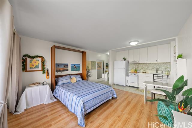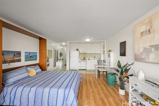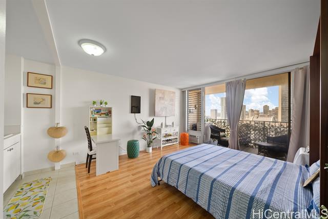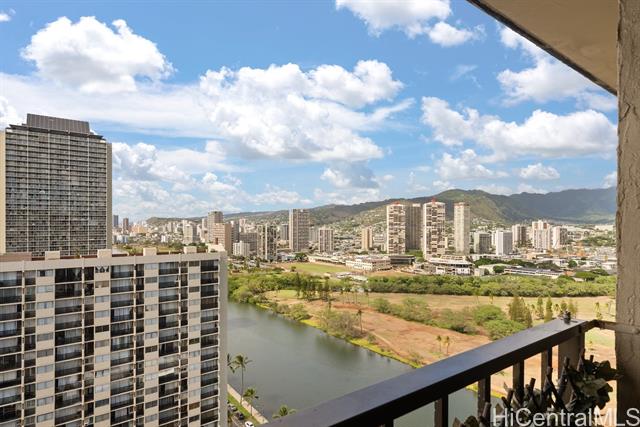 - Updated studio unit on the 27th floor in the heart of Waikiki- featuring canal, mountain and ocean views. Enjoy sunsets and Friday night Hilton fireworks from your lanai. Amenities include panoramic rooftop view with heated salt-water pool, fire pit, multiple bbq stations, covered lounge areas and sauna. Unit sells furnished with in-unit washer/dryer, custom wall-bed, ceramic tile and laminate flooring, ready for you to move in or rent out. Other features include assigned covered parking stall, guest parking, fob access to building, and on-site management. Contact us to schedule a private showing today.