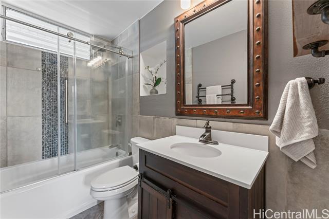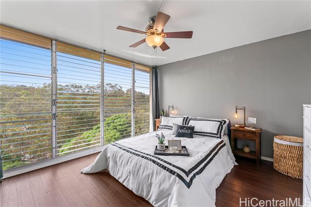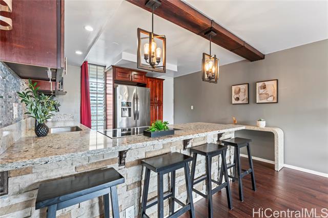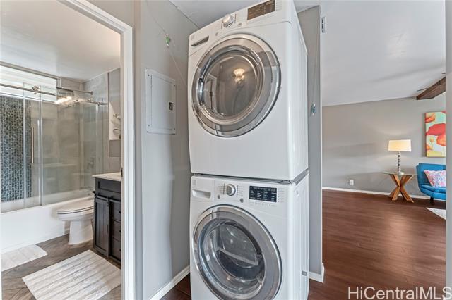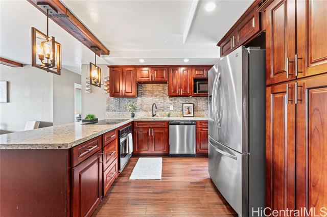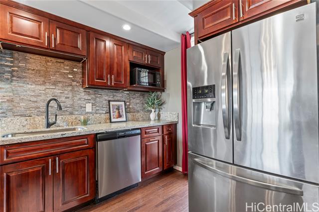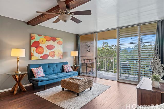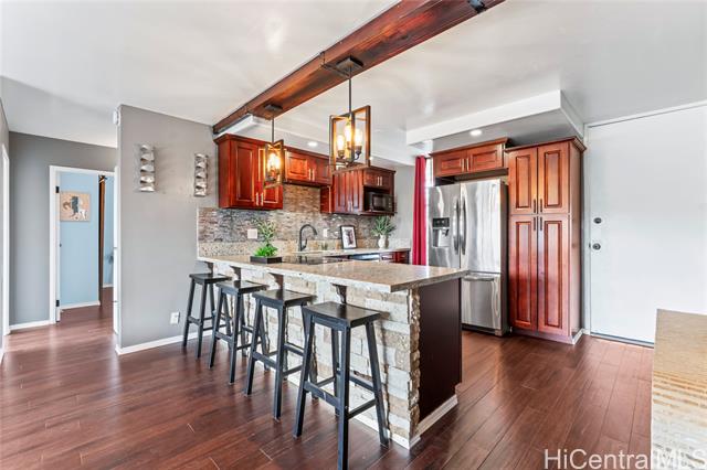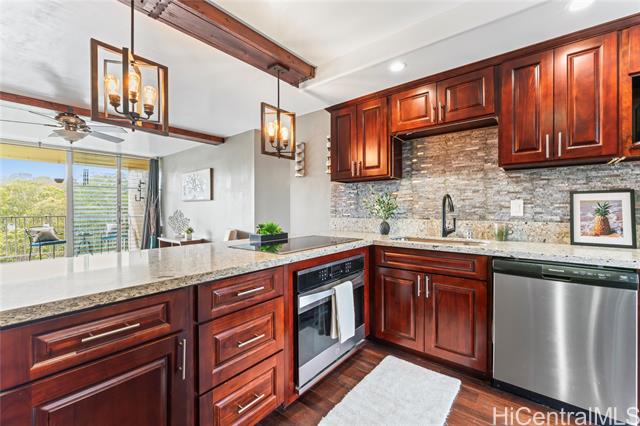 - Treetop breezes and gorgeous valley views from this uniquely renovated 2 bedroom, 1 bathroom, 2 parking (one covered), condo with in-unit laundry (in the hallway, NOT in the kitchen)& external storage area. Kitchen features upgraded cabinets and appliances, stone countertops and backsplash, pendant lights and breakfast bar overlooking living room. Living room features wood beam ceiling, with ceiling fan and access to the lanai with gorgeous, breezy views (You can even see the swimming pool!). Storage area approximately 6' x 6' and located on the 9th floor. Two assigned parking spaces, one covered on the second floor and one uncovered on the third floor. You DON'T have to walk up any stairs to get to the unit from the parking stalls. There are walking bridges to the building from both stalls. Maintenance fee covers sewer, water, trash, cable and internet. 5 minute drive to Wheeler Army Airfield. 10 minutes to Schofield Barracks and NCTAMS. 15 minutes to HMR. 25 minutes to JBPHH. 30 minutes to Fort Shafter/Camp Smith. *School zones obtained from Hawaii DOE School Finder website. Buyer to verify.