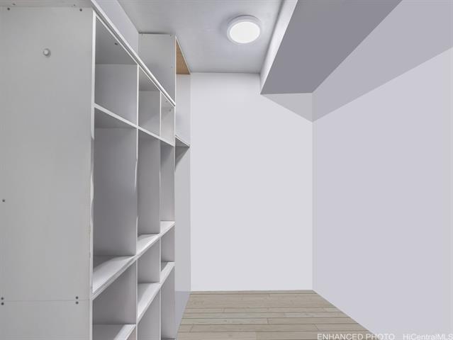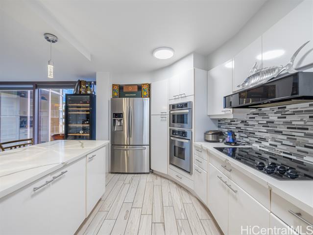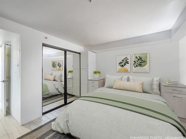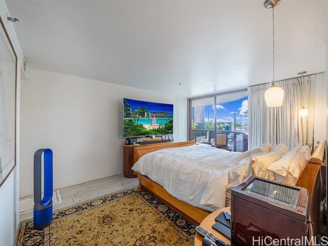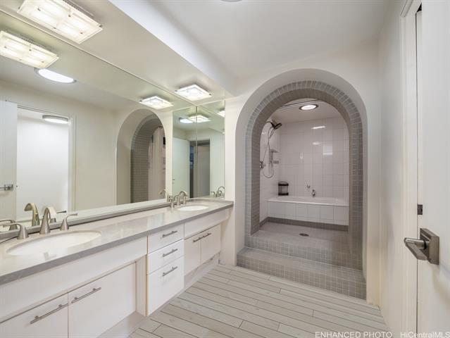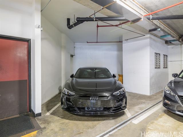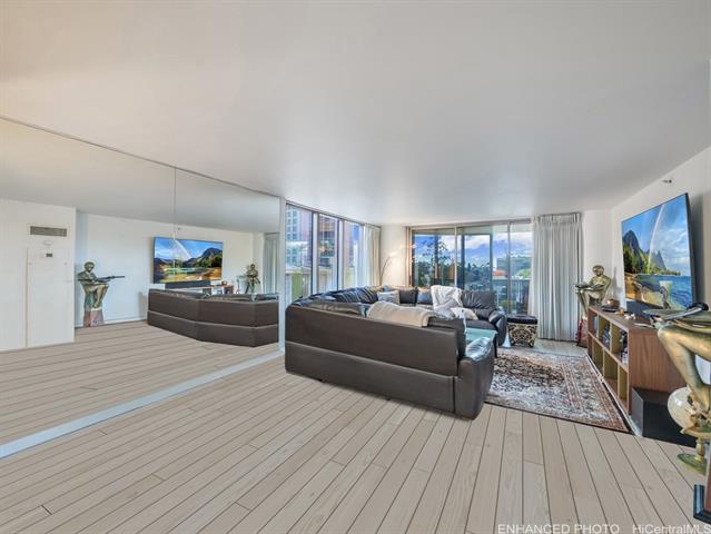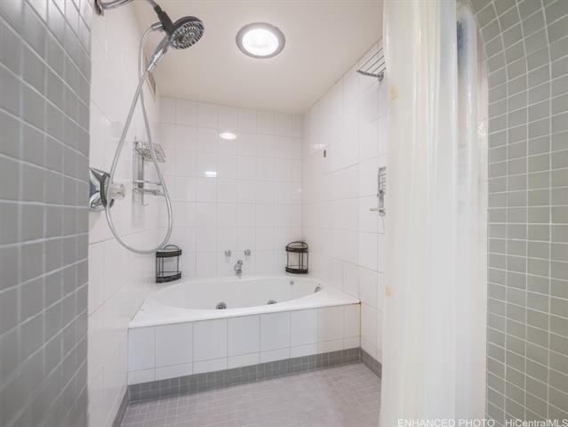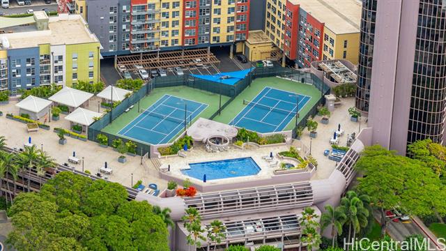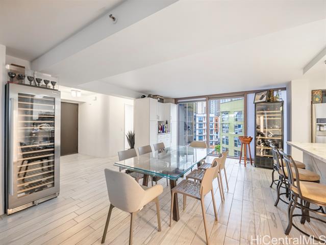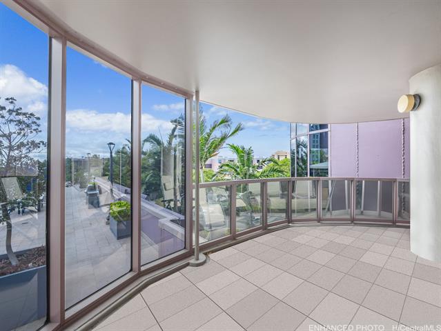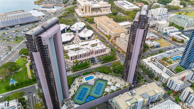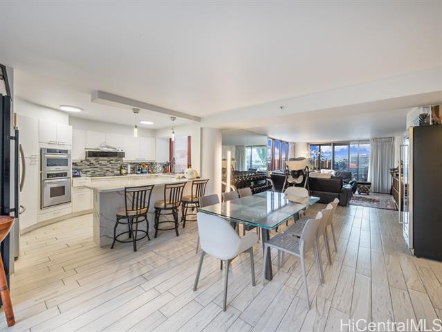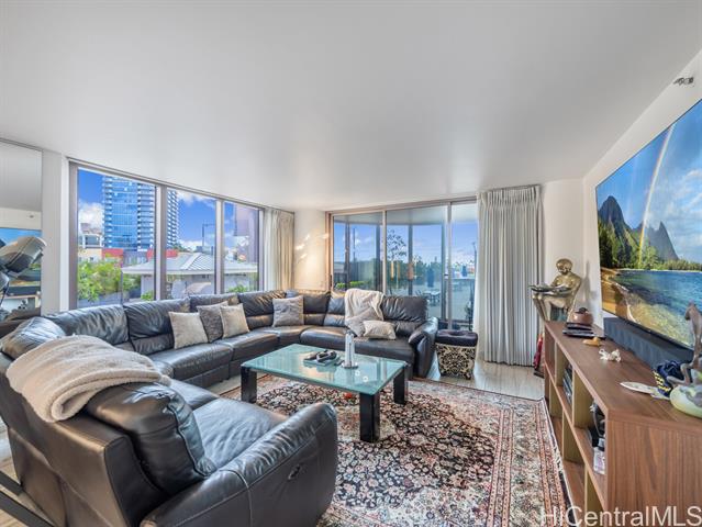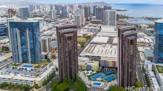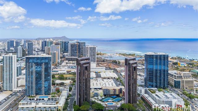 - Experience the best of urban island living in this spacious 2-bedroom, 2-bath, 2-parking unit located in the heart of Kaka'ako- Hawaii's most dynamic and vibrant neighborhood. This low-floor corner unit features a generous lanai with tranquil tree-top and ocean views, perfect for relaxing or entertaining. Inside, the unit boasts a sleek, glossy ceiling and large living room mirrors that enhance light and space with wall to wall porcelain plank tile flooring. The recently renovated kitchen is both modern and functional, showcasing wide quartz countertops and island, ample cabinetry and drawers, newer appliances, and a built-in bar. Comfort is ensured with a rebuilt A/C system and new thermostat. The primary suite includes walk-in closet and an ensuite bathroom with updated shower tile. Floor-to-ceiling windows and sliding doors complete with new drapes and blinds fill the living and dining areas with natural light, creating a bright, townhouse-like atmosphere with the security and convenience of condo living. Enjoy access to impressive amenities including two fire pits, party cabanas, and more. Ideally situated near SALT, downtown, Aloha Tower, hospitals, beaches, & restaurants.
