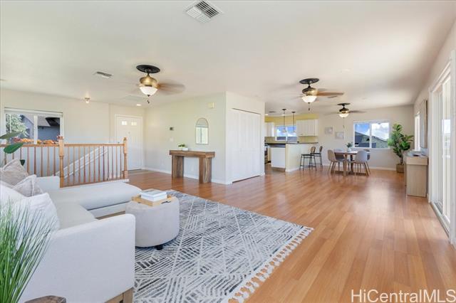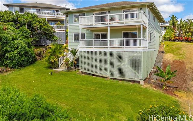 - Discover an exceptional opportunity with this expansive perimeter lot nestled within the gated community of Seascape at Makakilo. This spacious 3-bedroom, 2.5-bathroom detached home features one of the largest floor plans available. Enjoy breathtaking westward views of sunsets, coastline, and vibrant city lights against a backdrop of majestic mountains. The generous open and covered lanai decks create the perfect setting for outdoor entertaining and relaxation. This home features quality upgrades, including a state-of-the-art central AC system with a four-zone configuration ($48k investment), upgraded patio railings, beautifully landscaped yard, and numerous other enhancements that elevate its appeal. Situated on the cooler side of Makakilo Heights, this residence offers the convenience of being close to Kapolei City, with easy access to a variety of dining options, shopping centers, the luxurious Ko Olina resort, freeway access, golf courses, and all the essential amenities that enhance city living. The maintenance fee of $523 covers water, sewer, and common area expenses—an incredible value for this expansive 10,395 sqft rim lot. This is a VA approved residential community.