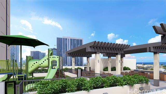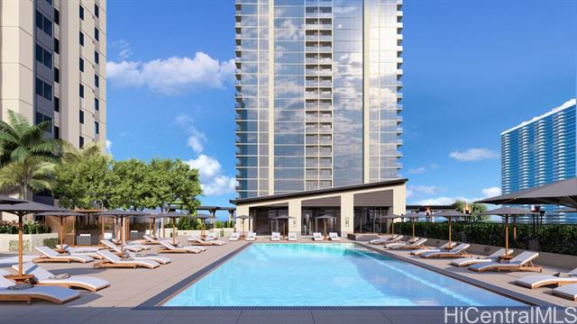 - Perched high on the 25th floor, this refined corner residence in Rycroft Tower offers a peaceful retreat above the city. Floor-to-ceiling windows frame sweeping ocean and Diamond Head views, while a spacious wraparound lanai extends your living space into the open sky. Interior features include luxury vinyl plank flooring in both bedrooms, quartz countertops, premium stainless steel appliances, and an in-unit washer/dryer. A quiet split AC system ensures year-round comfort. The resort-style amenity deck features an infinity-edge pool and spa, multiple BBQ and lounge pavilions, a theater room, co-working and media spaces, and a fitness center with yoga studio and sauna. Secure covered parking, EV charging stations, bike storage, pet-friendly policies, and 24-hour security add ease to everyday living. Ideally located near Ward Village, Ala Moana Center, and Oahu’s best beaches, this home offers elevated island living with exceptional convenience. Watch daylight soften into warm ocean tones as sunset colors drift across the skyline and sea. Where modern design and panoramic horizons meet at the edge of the sky.