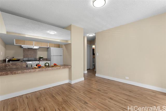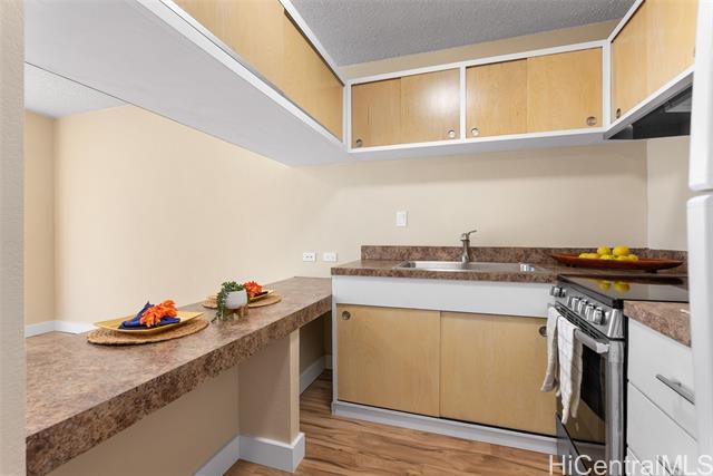 - Welcome to this beautiful URBAN TREASURE! This RENOVATED 1-bd, 1-ba CORNER/END unit features an ENCLOSED lanai & NEW Mohawk WATERPROOF LAMINATE floors throughout. Enjoy abundant NATURAL LIGHT in your NEW KITCHEN w/formica counters, NEW stainless sink, NEW disposal, newer refrig/stove & FRESH HARDWARE. Entire unit is refreshed w/NEW paint & fixtures, NEW locks, NEW lighting & NEW baseboards. Additional features include NEW plumbing valves, NEW window cranks, REGLAZED tub, NEW toilet & vanity! COVERED parking stall, community laundry & easy freeway access—your stylish, move-in ready gem awaits! A few photos have been virtually staged(enhanced). HOA fee starting March 2026 $537.88