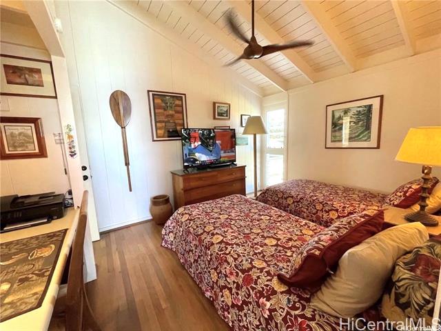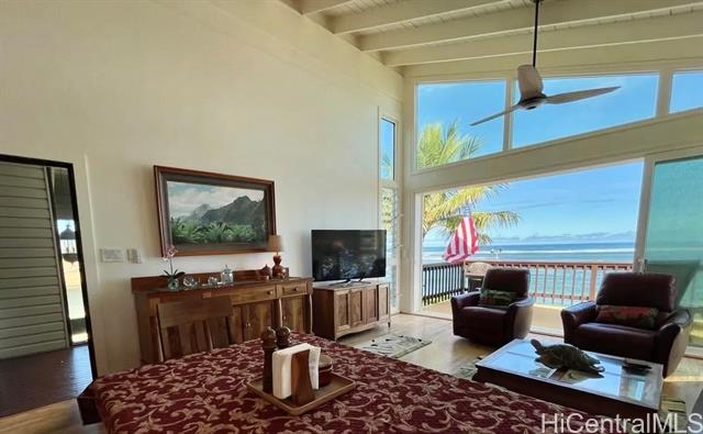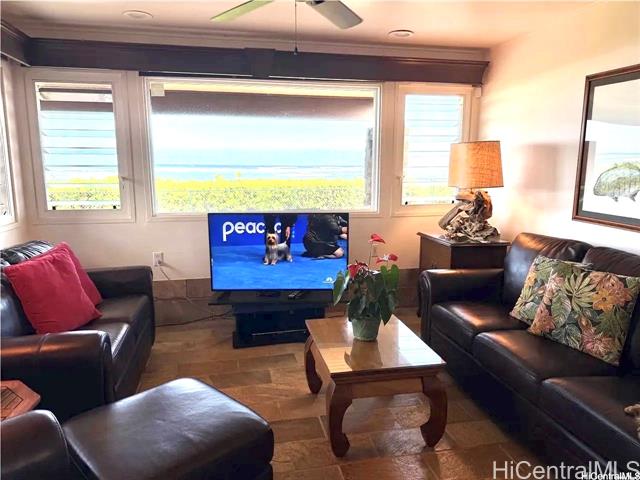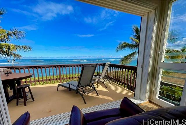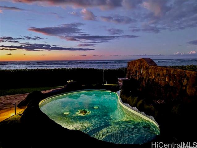 - A rare beachfront opportunity in Waialua this exceptional estate offers over 66 feet of ocean frontage along a beautiful white-sandy beach. Enjoy the best of North Shore living with stunning ocean views, turtles and seasonal whale watching right from your backyard. This gated estate features tiled, salinated, lava rock, solar-heated, swimming pool, surrounded by lush tropical landscaping and expansive quartzite patios. This residence has been beautifully remodeled with ohia floors, cherry cabinetry, Sub-Zero and Wolf appliances, and standing seam aluminum roofing. Designed for flexibility and comfort, the home offers multiple living configurations ideal for multigenerational living or investment (duplex style 3/2 up and 1/1 down). Highlights include four spacious bedrooms, three custom bathrooms, a home office/guest suite with a separate entry and panoramic ocean views through custom coastal windows and sliding glass doors. Modern amenities include 24 owned PV panels with net metering, monitored security, and an on-demand gas water system. Experience the serenity and privacy of Waialua's beachfront lifestyle- swim, surf, or relax to the sound of the waves.