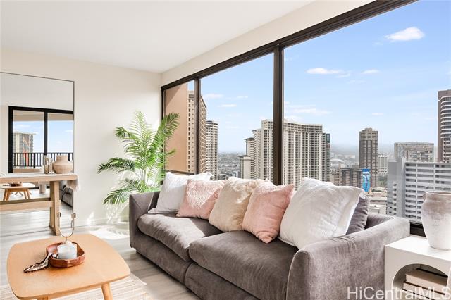 - BREATHTAKING VIEWS + PRIME WAIKIKI LOCATION! Welcome to Discovery Bay, one of Waikiki’s most desirable buildings offering convenience, security, and resort-style amenities. This beautifully updated corner-end unit features floor-to-ceiling windows, vinyl plank flooring, a renovated kitchen, and a spacious 1,003 sq ft layout rarely available at this price point. Enjoy stunning ocean, marina, mountain, and city views from every room, plus a generous lanai perfect for sunrise coffee or sunset relaxing. The bright open living area flows seamlessly into the dining space and kitchen, creating an inviting retreat high above the city. The primary suite offers incredible natural light and postcard-worthy views. Central AC, in-unit laundry, and secure parking add comfort and ease. Building amenities include a pool, whirlpool, fitness center, BBQ deck, sundeck, 24-hour security, and on-site management. Located steps from the Hilton lagoon, Waikiki Beach, and Ala Moana Center. Easy to show—experience island living at its best!