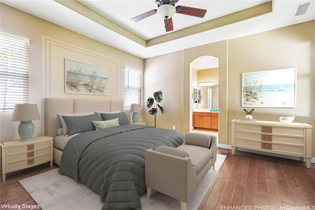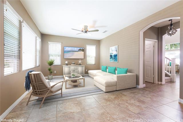 - A rare first-floor primary bedroom with full ensuite bath provides convenience & flexibility in this spacious 4-bedroom, 2.5-bath home in the desirable Ocean Pointe neighborhood. Dramatic two-story ceilings and lots of windows welcome you into the light-filled living room and separate dining room--which could double as an office, if preferred. A 2nd living area provides generous space for relaxing or entertaining and opens into large, open, well-appointed kitchen with eat-in bar, tons of counter space & newer stainless-steel appliances. Primary bedroom includes walk-in closet, and bathroom w/ double sinks, a soaking tub & separate shower. A covered lanai adds outdoor living enjoyment next to large backyard. Upstairs are three additional bedrooms with shared full bath, plus dedicated office area providing a perfect setup for working from home or studying. Enjoy a larger yard than many homes in the area, plus a 2-car garage with ample overhead storage. Leased PV panels help keep electric costs down. Near parks, schools, shopping, and community amenities, this property offers space, versatility, & an excellent location in much-favored Ocean Pointe neighborhood. Click links for video.