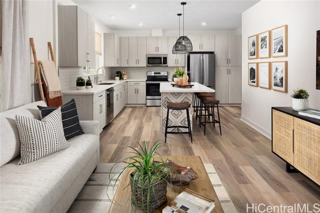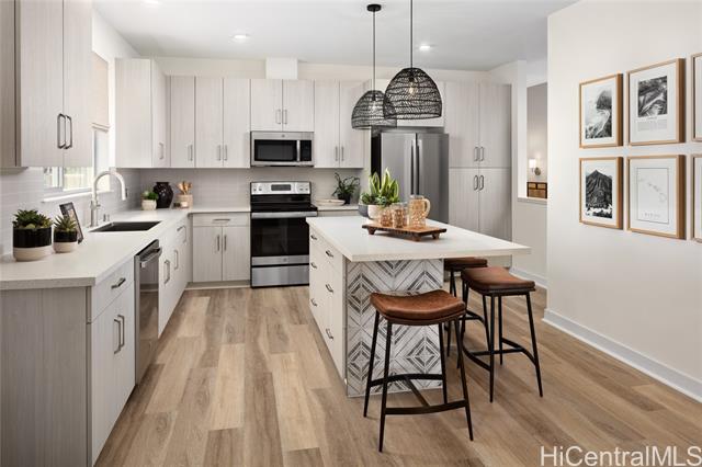 - Available Now! Welcome to Ka’ulu by Gentry, the newest residential community in Kapolei! Brand new, 3 bedroom 2 bath town home with attached garage offers interior appointments such as: 9” ceilings, designer laminate cabinets with soft close; luxury vinyl planks throughout; solid surface countertops, Stainless steel appliances, spacious primary walk in closet, mirrored doors & more. Numerous energy saving features to keep your bills low: spray foam insulation in the ceiling & exterior walls; central AC-high efficiency rated SEER2 (16+)certified; low-E impact-resistant vinyl windows; solar water, digital thermostat; LED lighting package; insulated roll-up garage door; (EV)electric vehicle ready; energy star appliances. Boasting a huge covered lanai, and a great location, only a quick jump to the freeway and a few minutes to the beach, shopping and restaurants! Seller offering a 3% credit for buyers closing costs, points and buy downs. Come and see all our model homes and other options. Photos are of model home.