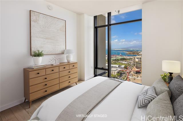 - Gorgeous Grand Penthouse 4007 at front-row Victoria Place is high above the rest, with stunning, extra-tall ceilings and glass clerestory windows opening up sea and sky views. There is nothing else like this very top floor! Because of the height, you see over many of the other buildings downtown to the beautiful Waianae Mountains in the distance. Never-lived-in, PH4007 is in truly pristine condition. Brand new cabinetry and hardwood floors are of the highest quality. The bathroom is luxurious with fine stonework and plenty of storage. Amenities at Victoria Place are like a deluxe resort with three pools, hot and cold plunge pools and saunas in both men's and women's spa areas. Elegant party spaces include one with a private pool for your guests at parties. Don't miss this chance for penthouse living at a reasonable price in a very spacious one-bedroom suite.