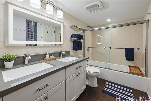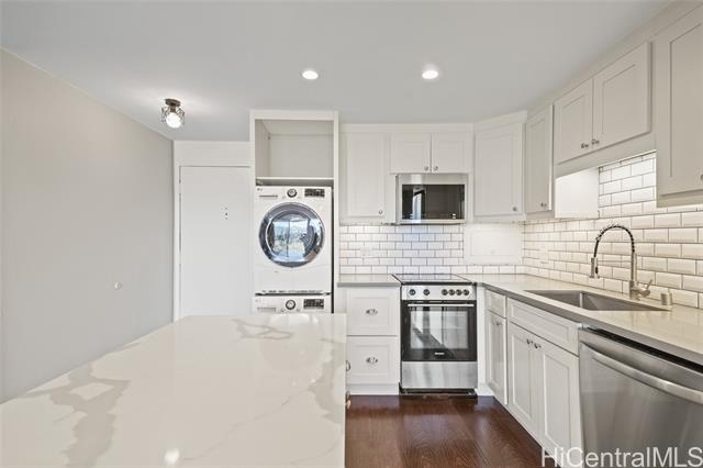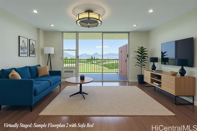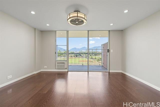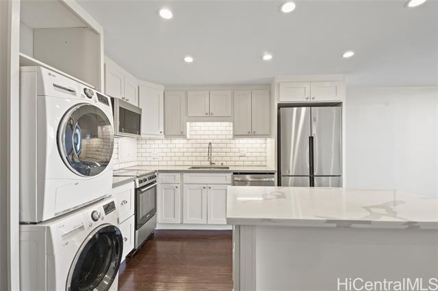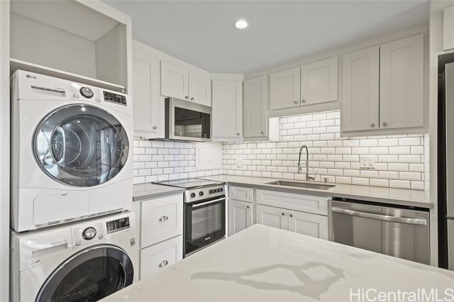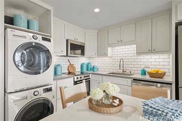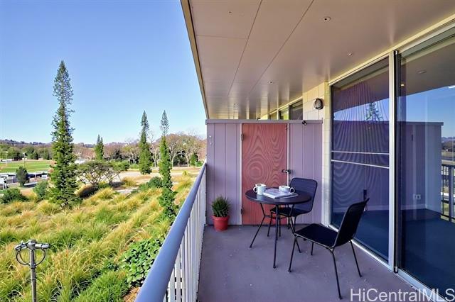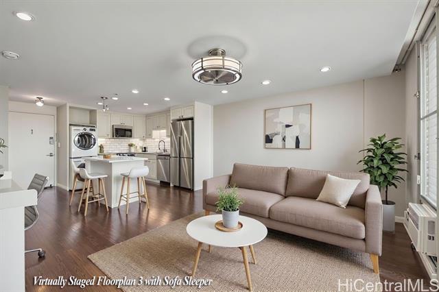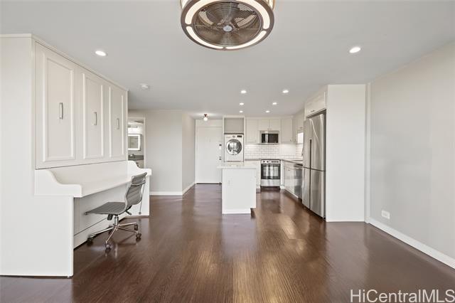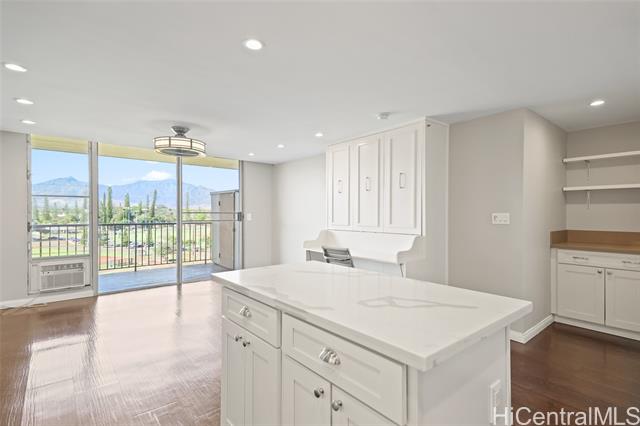 - Step into the luxurious Kemoo By the Lake #810—a fully remodeled modern studio with a 98 sq ft lanai showcasing serene mountain views and postcard sunsets. This designer space features a chef-inspired kitchen with quartz countertops, subway tile walls, a River White island, & a full suite of premium stainless appliances including full-sized Haier quad-door refrigerator, Blomberg convection range, Midea dishwasher, convection oven microwave, & touchless faucet. Enjoy in-unit laundry, beautifully integrated with cabinetry and high-efficiency LG washer/dryer. The spa-quality bathroom impresses with floor-to-ceiling quartz, KOHLER cast-iron soaking tub with glass doors, double-sink vanity, LED anti-fog mirror, & premium Delta fixtures. A sleek Murphy wall bed with desk, recessed LED lighting, luxury vinyl plank flooring, air conditioning, smooth-finished walls/ceiling & smart Schlage keypad lock elevate everyday comfort.Perfectly located across from Schofield Barracks with easy freeway access—modern living, maximum convenience, and exceptional upgrades throughout. (see supplements for complete Renovation List).