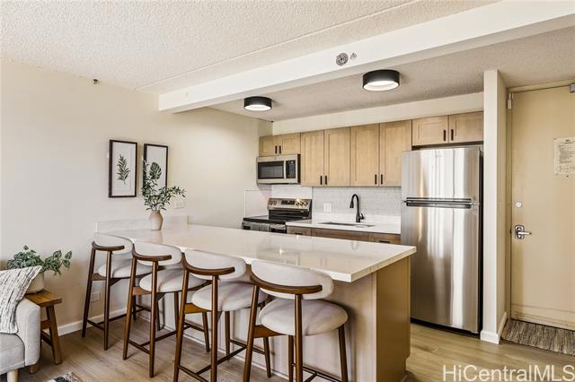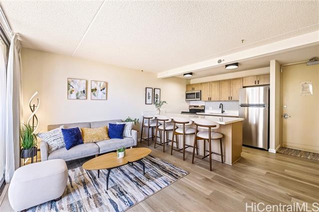 - Legal Short-Term Rental with Parking and central A/C. Beautifully renovated and fully furnished 1-bedroom, 1-bath unit in the desirable Waikiki Sunset condominium. Modern finishes, open layout, central A/C and private lanai with peek-a-boo ocean views, city and mountain views. An unassigned parking stall is also included for ultimate convenience. Building amenities include swimming pool, sauna, fitness center, BBQ area and 24-hour security. Located in the heart of Waikiki, you’re a stone’s throw away from world-famous beaches, world-class dining, and endless shopping. Whether you want to surf at sunrise, dine under the stars, or generate income while you’re away, this Waikiki Sunset condo is the perfect blend of lifestyle and opportunity. Perfect as an investment or vacation home. Unit may be sold with all furniture, kitchen items and linens. See video walkthrough.