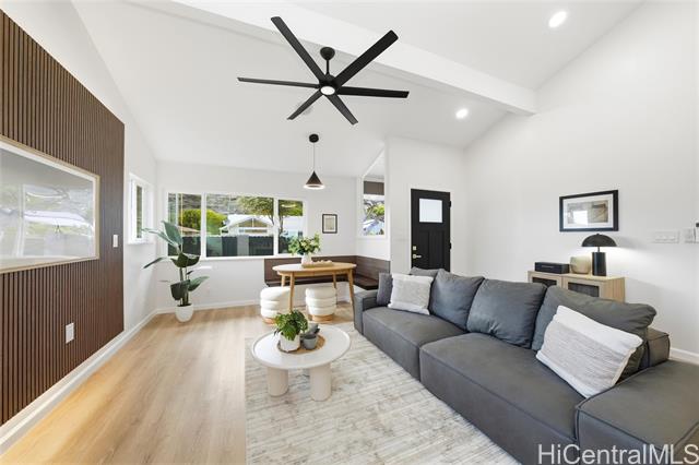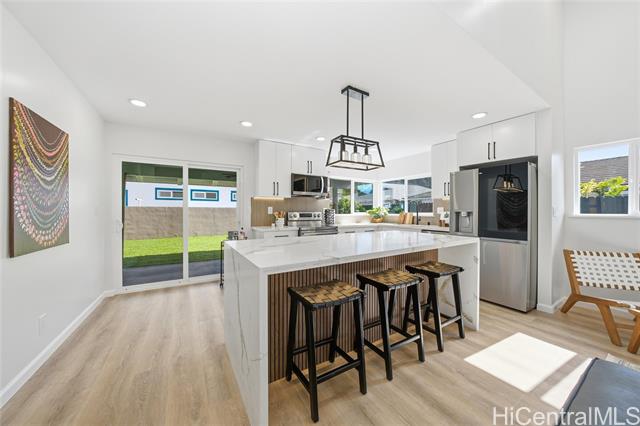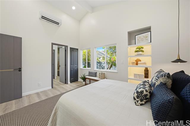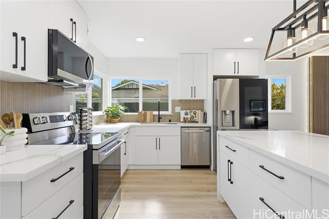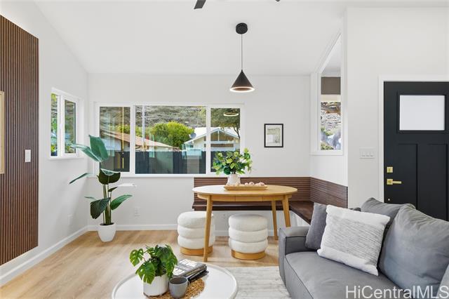 - Striking from the very first glance, this beautifully renovated corner-lot home defines contemporary island luxury. Thoughtfully designed with resort-inspired finishes and elegant bespoke upgrades throughout, the home exudes both warmth and sophistication. Light-filled living spaces flow seamlessly, featuring a kitchen ideal for entertaining, spa-like bathrooms, and a primary suite that feels like a private sanctuary with built-in shelving and designer accent walls. This three-bedroom, two-bath residence sits on an oversized 5,700-square-foot corner lot with a spacious fenced yard and fruit trees. Enjoy breathtaking views of Mariners Valley, 18 owned PV panels to offset electricity costs, and a prime Hawaii Kai location near parks, beaches, dining, and shopping. Truly the epitome of island living.