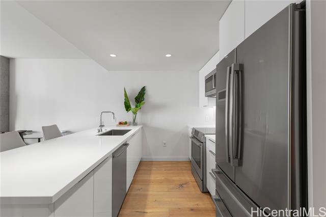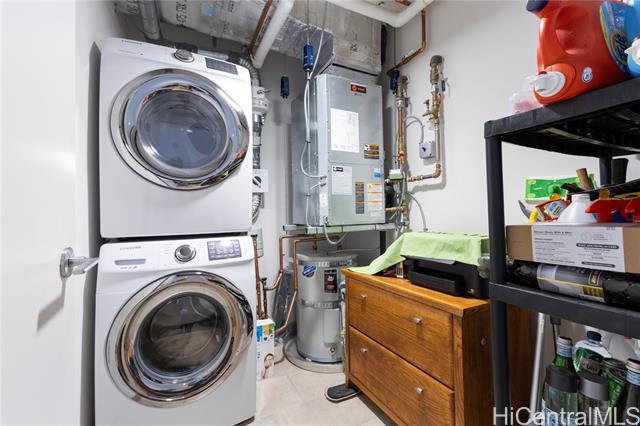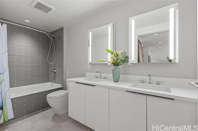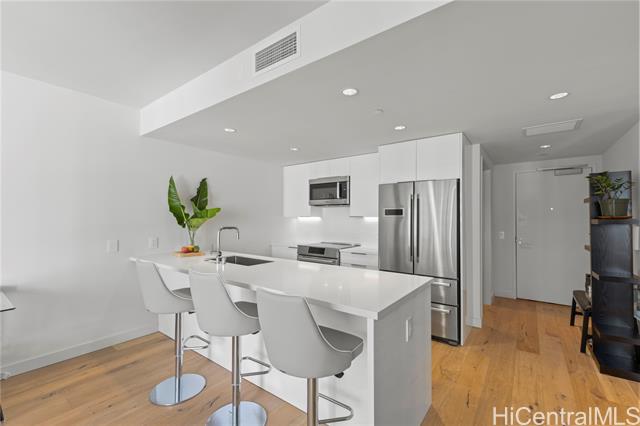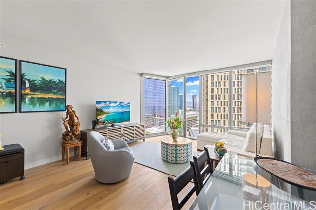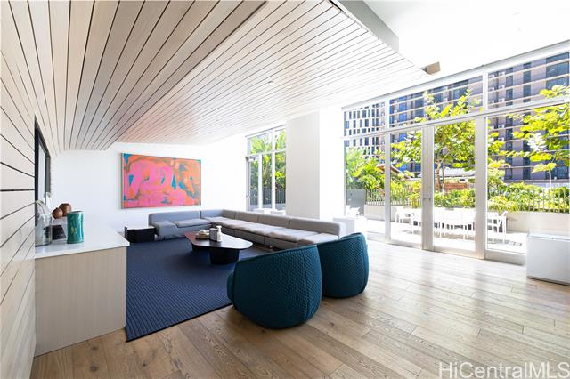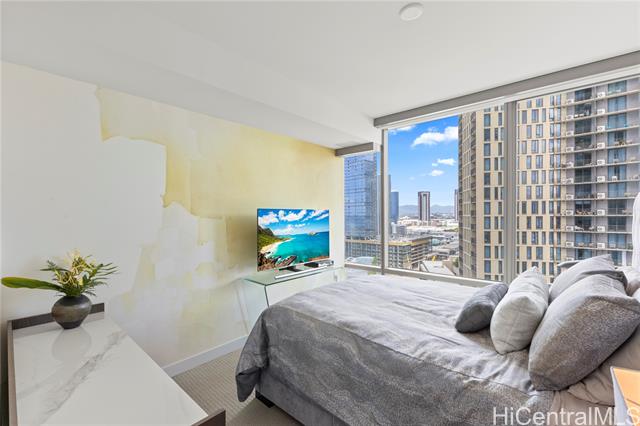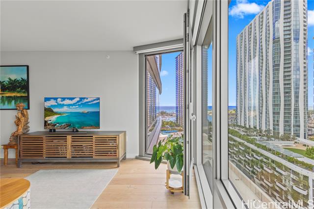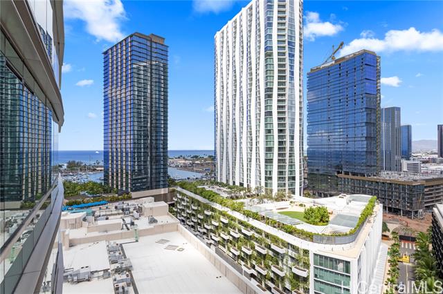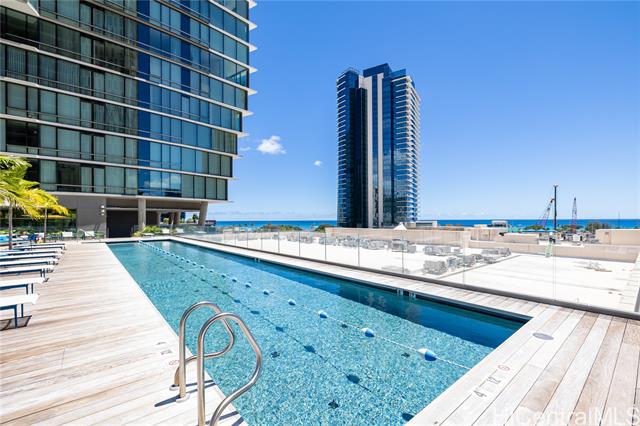 - Excellent 1/1 home at Ae'o with ocean, harbor and mountain views! At 739sf, this is the largest 1/1 offered at the lowest price/sf. This must-see unit has premium Bosch stainless steel appliances, spacious bathroom with deep soaking tub, custom built-ins in kitchen and walk-in closet, engineered hardwood floors, floor-to-ceiling windows and bump out window/door for fresh air. Unit also comes with a full size W/D in the extra utility room and one parking stall with a separate storage unit. Resort-like amenities include a 24/7 hosted front desk, rooftop terrace, lap and family pool, fitness center, locker rooms with sauna and steam room, theater, play ground, guest suites, outdoor bbq, dining cabanas. This Ward Village condo features the best of urban lifestyle in paradise with direct access to Whole Foods market, numerous dining and entertainment options, beaches, shopping, Consolidated Theaters, Ala Moana Shopping Center all within a few blocks! Condo is pictured fully furnished for staging purposes only; it is currently vacant and easy to show. The information herein may contain inaccuracies and is provided without warranty or guaranty of any kind.