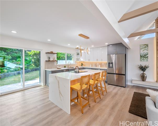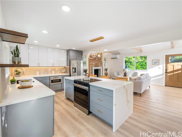 - NEW LISTING IN MANOA!! This completely renovated 3bed/2bath home is located in desirable Manoa Valley features an open floorplan, high cathedral ceilings, wine refrigerators, quartz counter tops, designer kitchen, resort-like bathrooms, new appliances, ALL new fixtures, recessed lights, backsplash, new cabinets, new windows, split AC's, accent walls, laundry room, cool breezes, quiet cul-de-sac, ample parking, an additional separate space perfect for home office/gym/man cave/or multi-generational living, and an enclosed landscaped yard perfect for pets, children, & entertaining family & friends. This home is conveniently located near Manoa Shopping Center, Manoa & Noelani Elementary, Manoa Park, Safeway, Punahou & Mid Pacific Schools, University of Hawaii, Chaminade, freeway access, many restaurants, banks, parks, bus stops & more…Don’t miss this opportunity!!